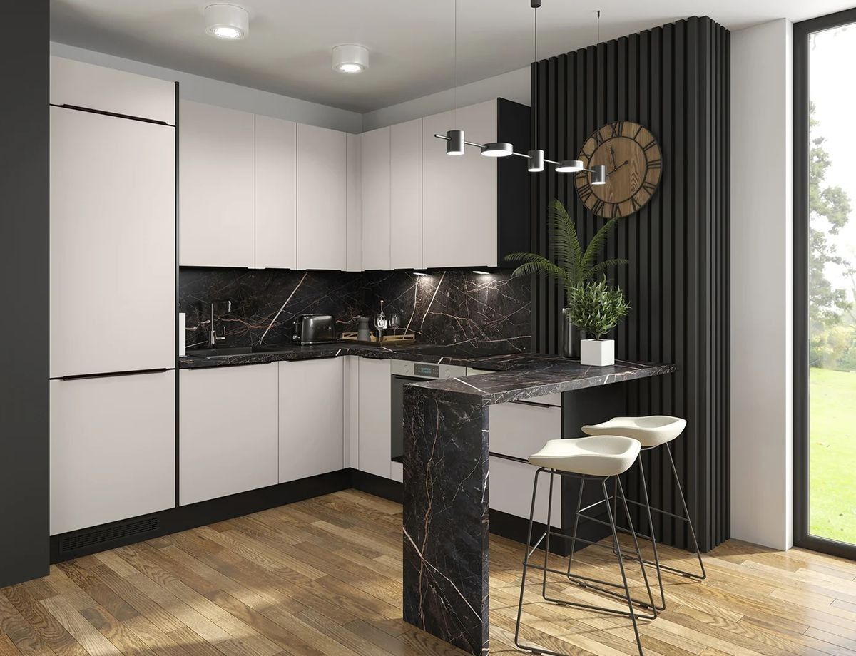 Beispiel Küche variabel stellbar NEU & Schnell Fronten: Sole Magnolie Perle (auch in schwarz matt und Eiche Halifax erhältlich) schwarze Griffleisten L6 Korpus und Sockel: schwarz Der Preis versteht sich ohne E-Geräte, Arbeitsplatten, Spüle und Dekoration. Griffe und Sockel sind im Preis enthalt