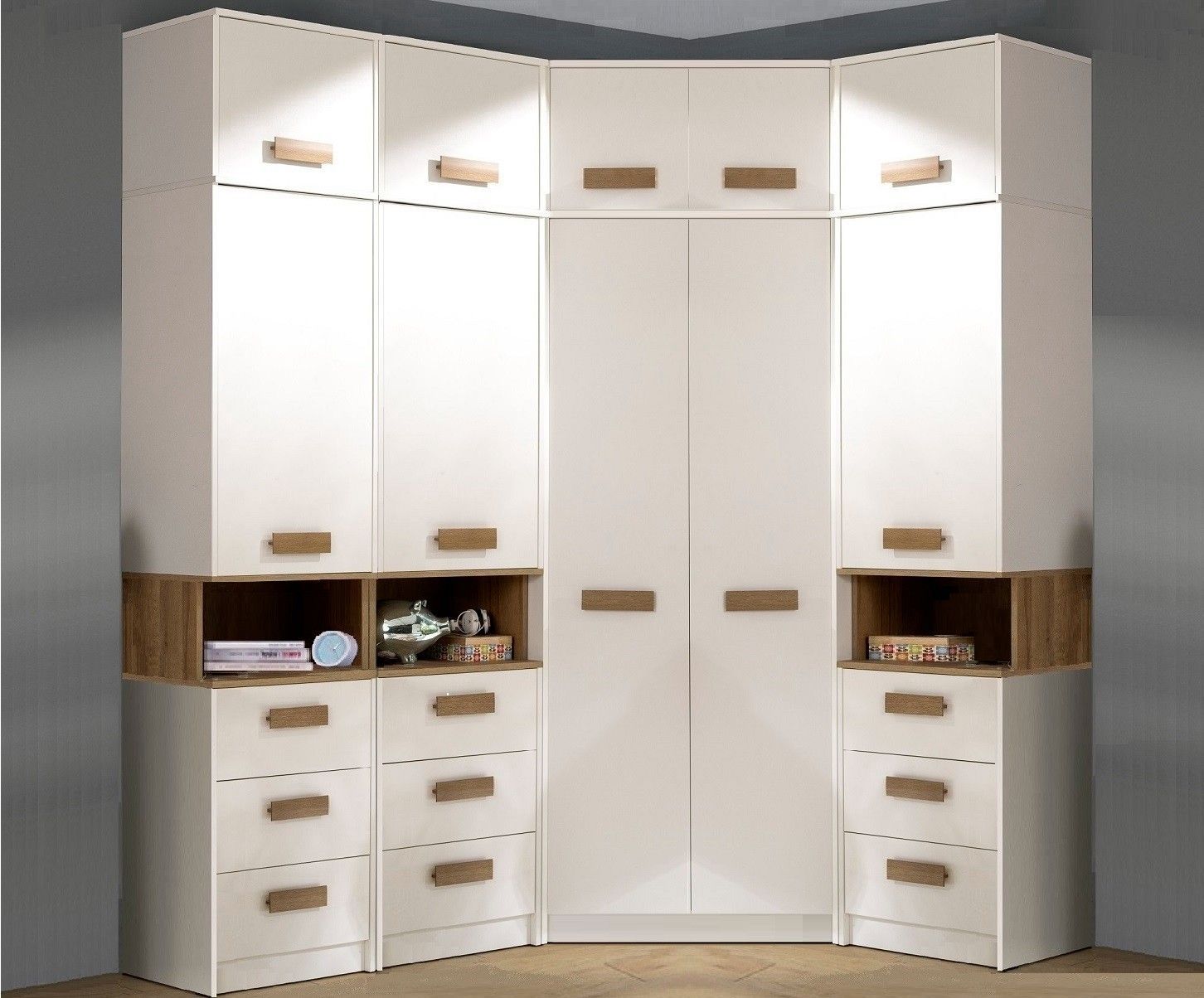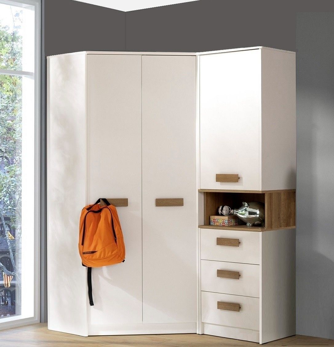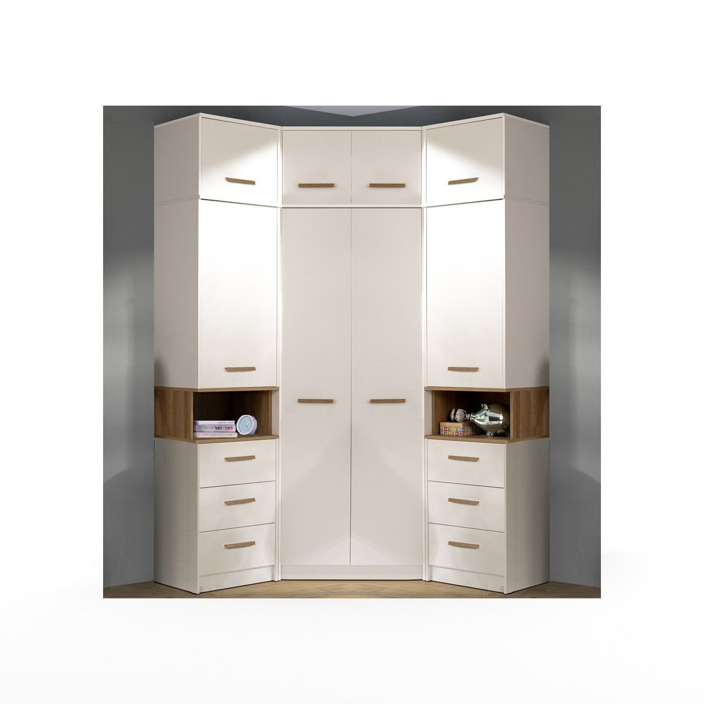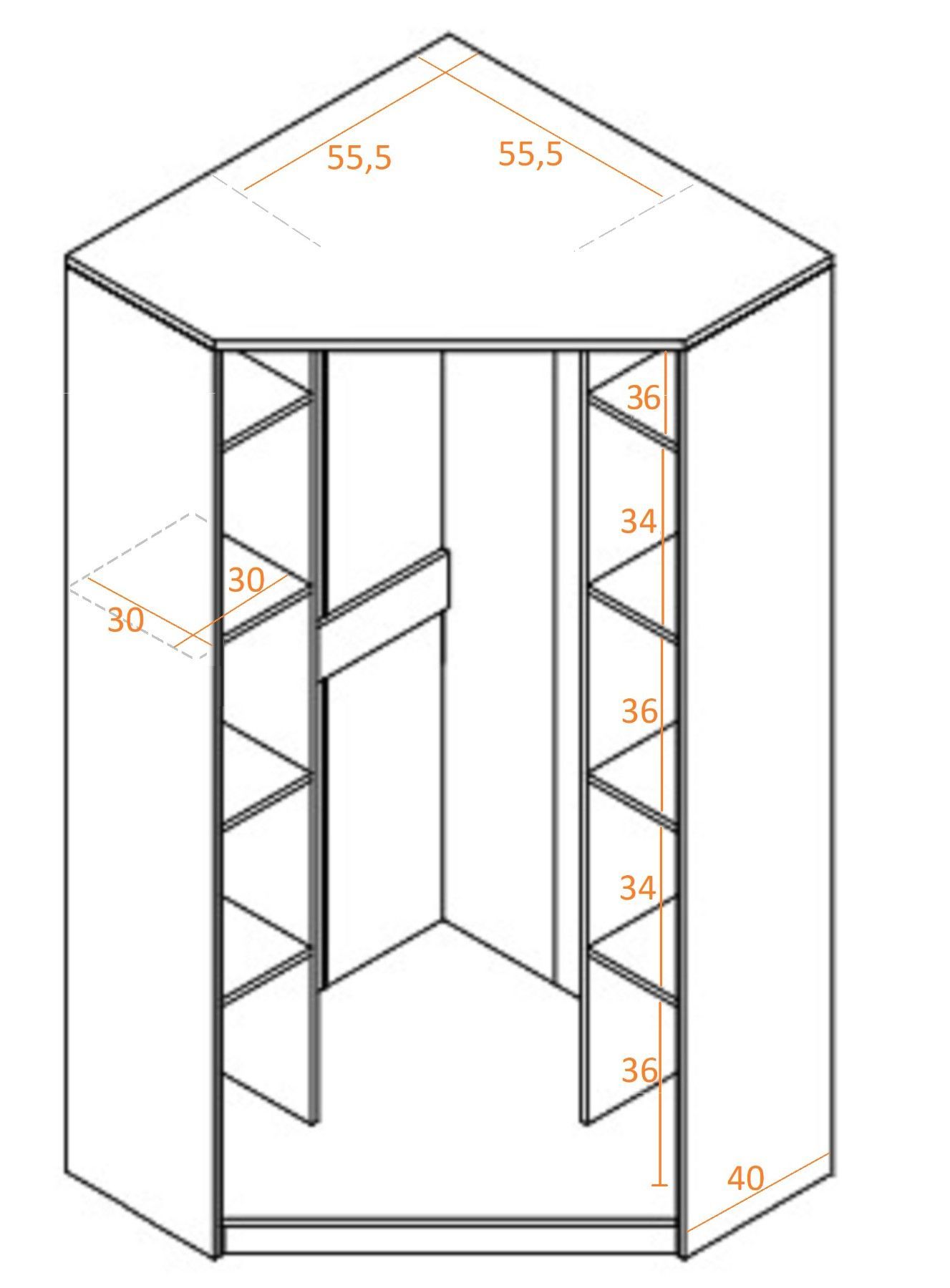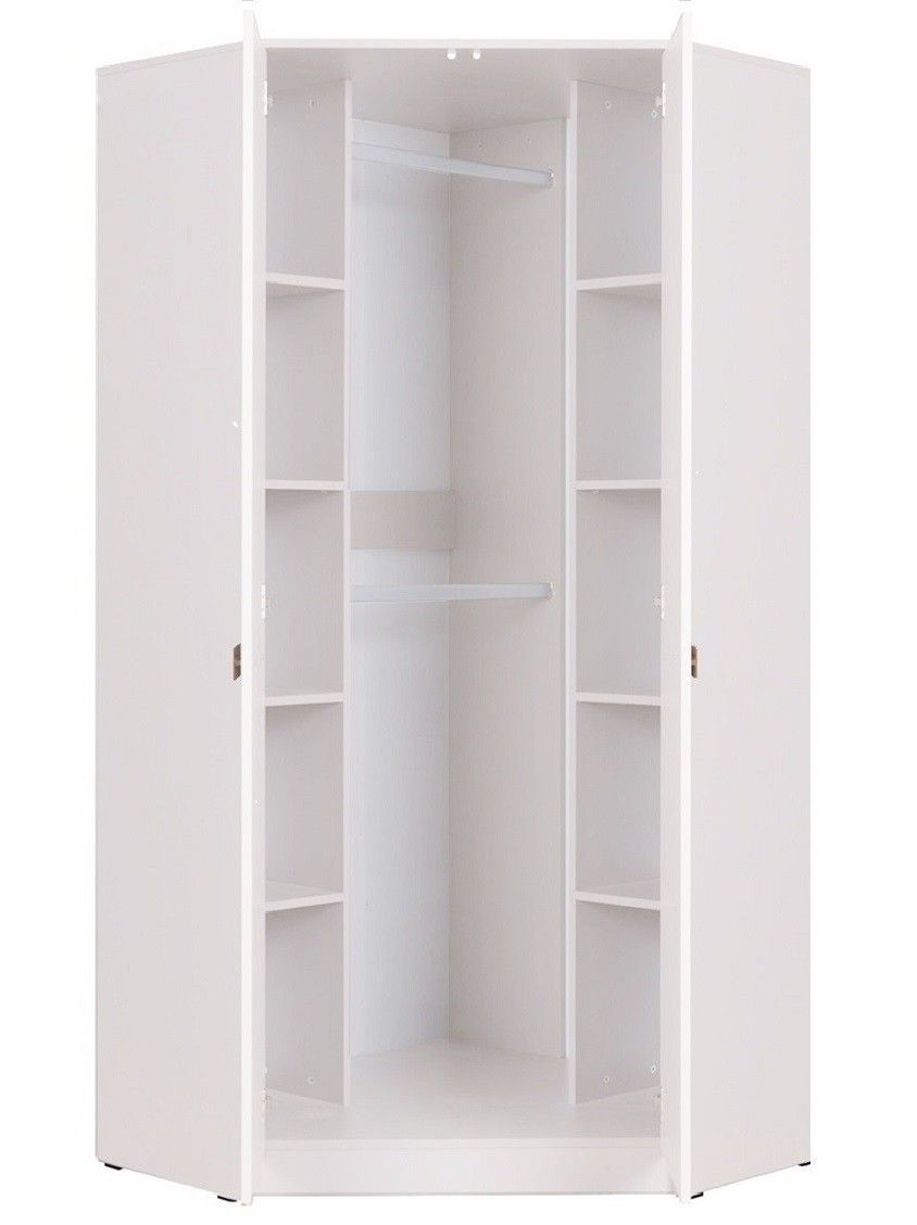 Eckschrank Grant 08, 91x185x91cm Kleiderschrank mit 2 Kleiderstangen und 10 Fächer