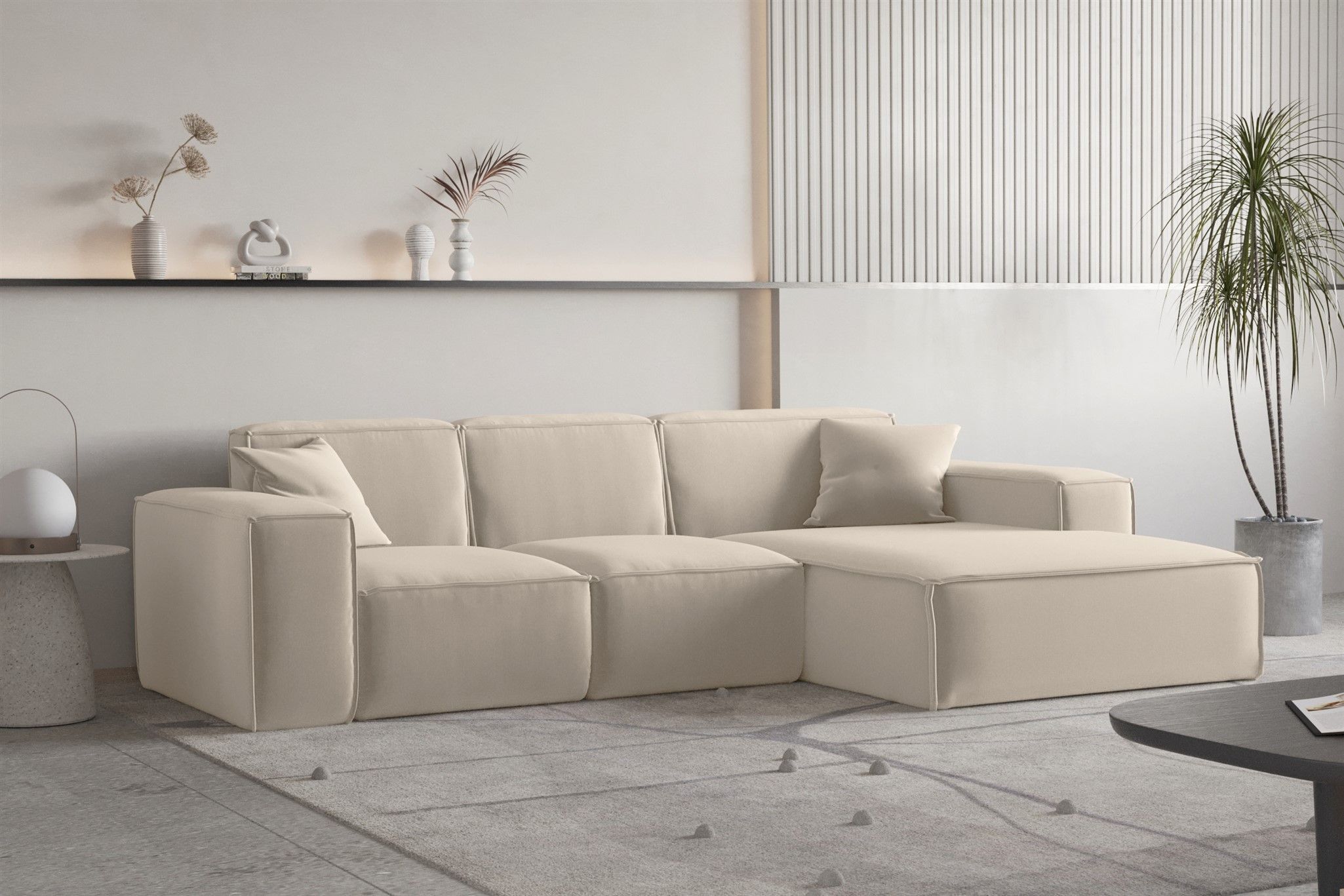 Ecksofa Designersofa CELES Premium Stoff Opera Velvet Beige Ottomane Rechts
