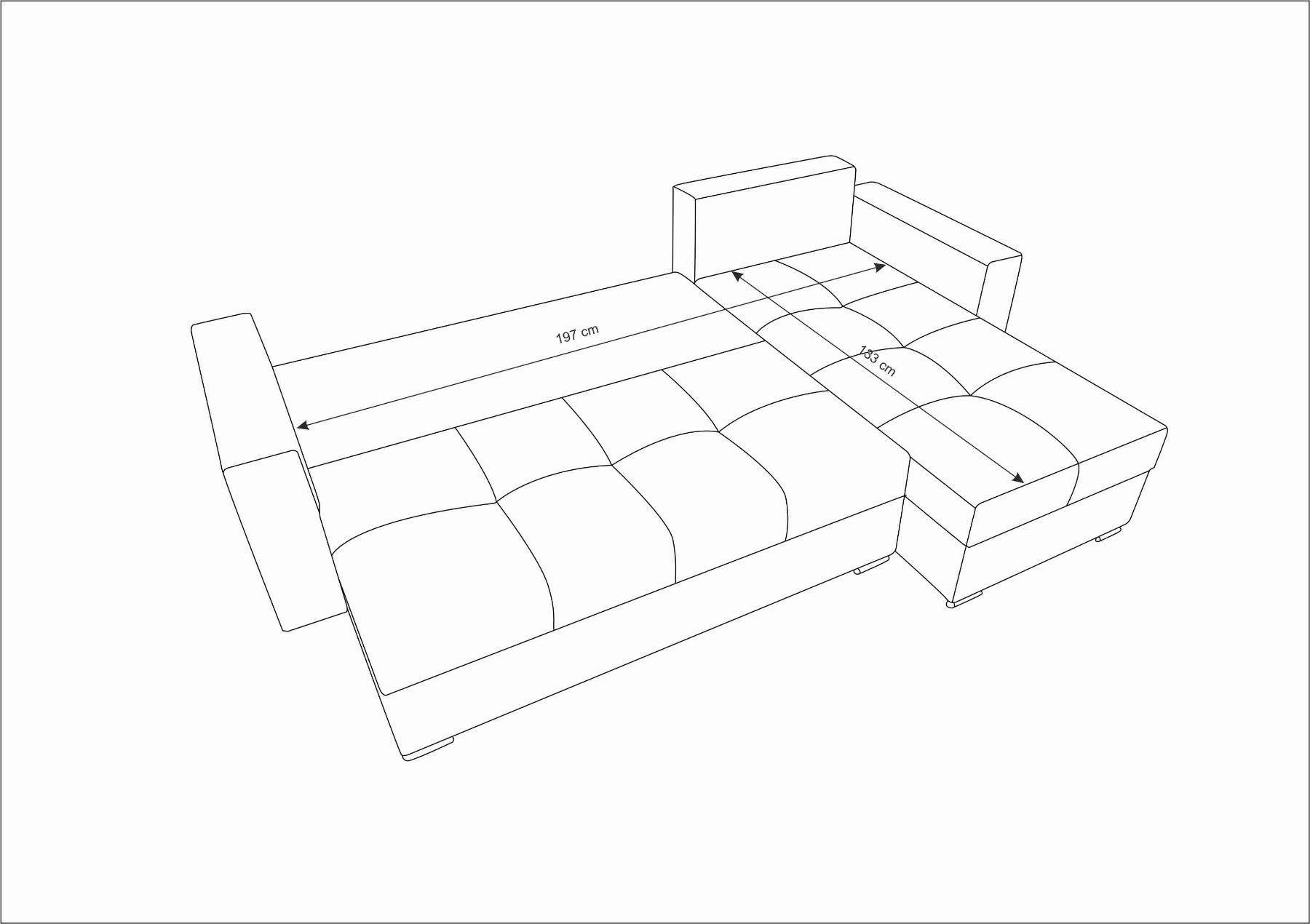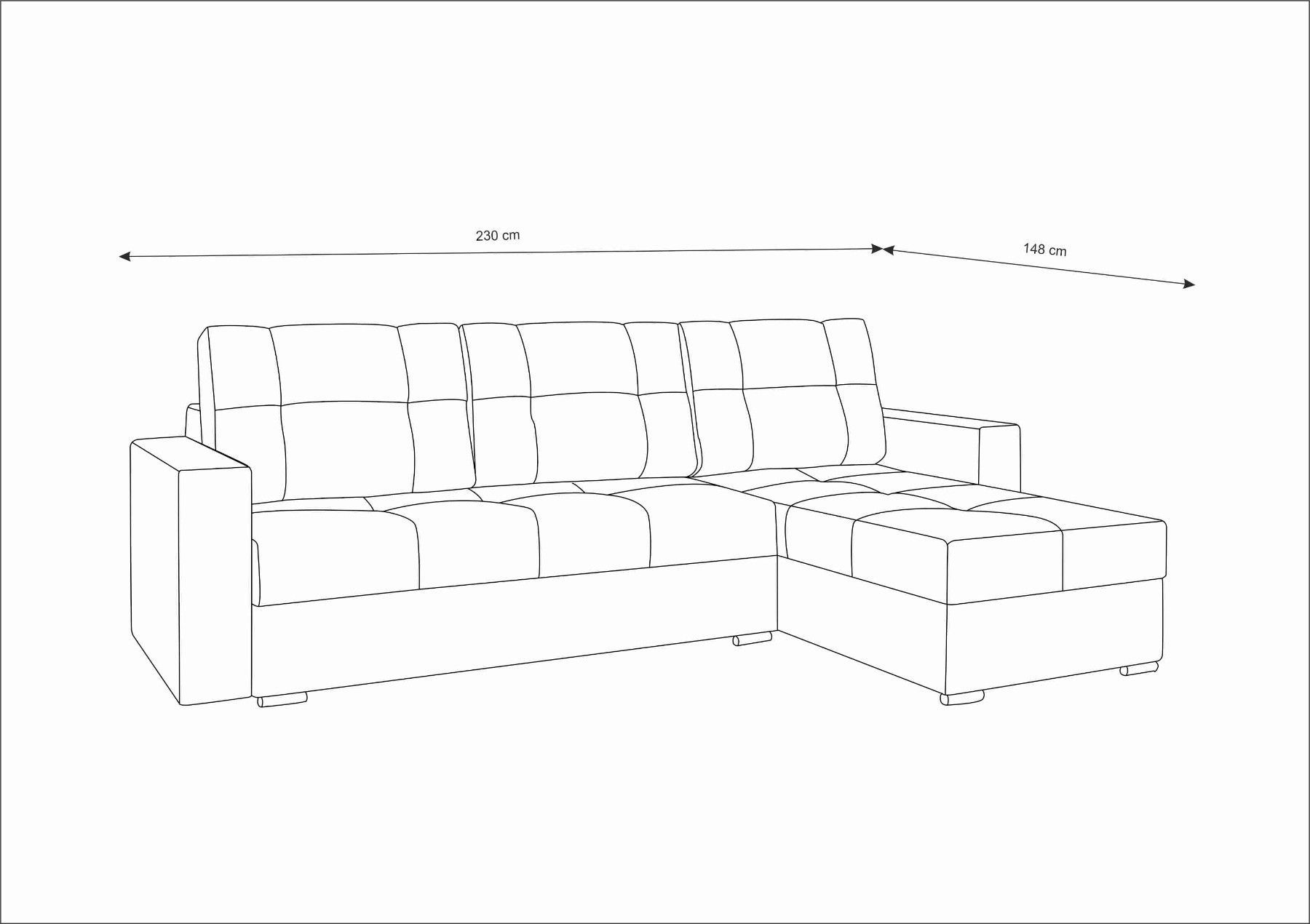 Gesamtabmessungen: Schlaffläche: 200x130 cm Gesamthöhe: 85 cm Breite: 230 cm Tiefe: 148 cm Sitzbreite: 131 cm Ottomane breite: 69 cm Rückenlehne: 72 cm Sitzhöhe: 42 cm Beine: 5 cm Frei stehende Ecksofa 1x Bettwäschebehälter Schlaffunktion, Bettfunktion Automatik auf Federn zum einfachen Öffnen des Behälters Geräumige, dekorative Kissen (3x) Ottomane Links oder Rechts bestellbar! Modell in vielen verschiedenen Farben erhältlich Breite, weiche Sitzfläche