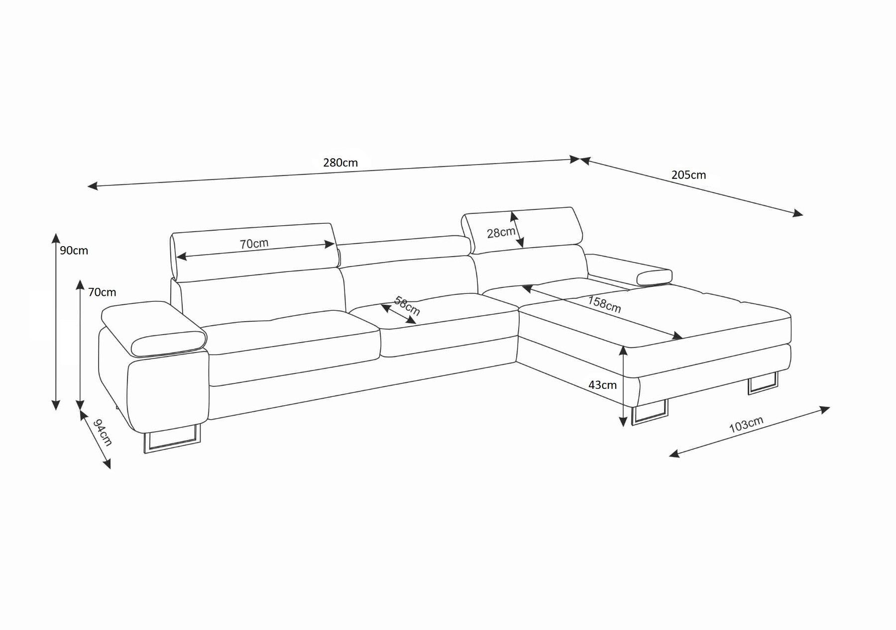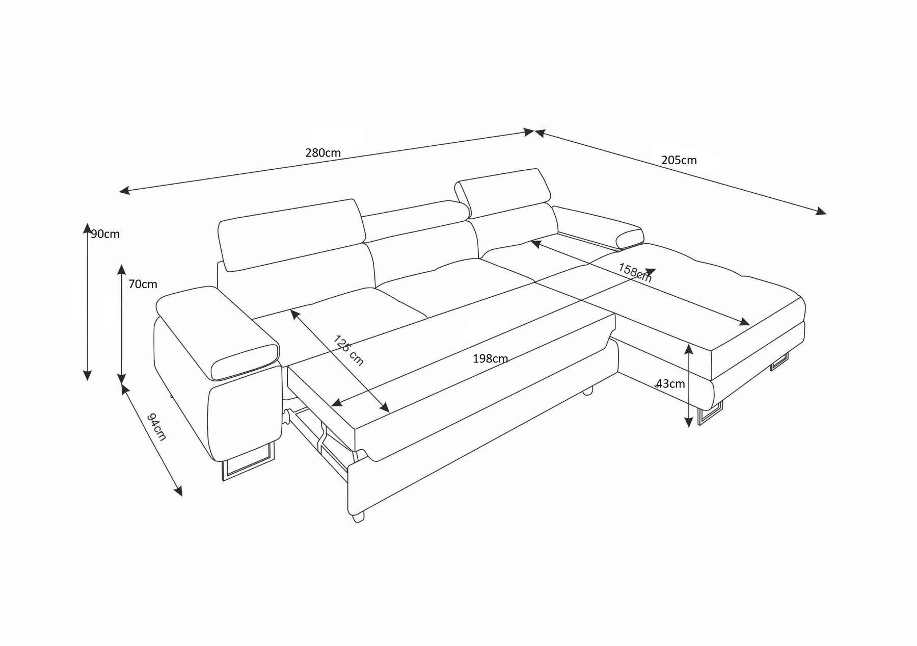 Ecksofa MERLIN mit Schlaffunktion und Behälter !!!!!!! Gesamtabmessung: Eckbreite: 280 cm Ecktiefe: 205 cm Höhe : 70-90 cm Sitzhöhe: 43 cm Schlaffläche: 198 x 125 cm