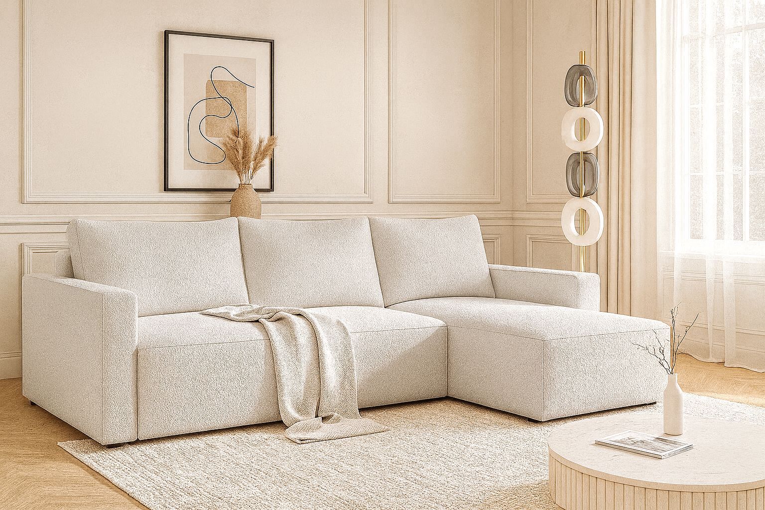 Ecksofa NOYO boucle 230 cm Schlaffunktion mit Bettkasten sofa Bonellfedern