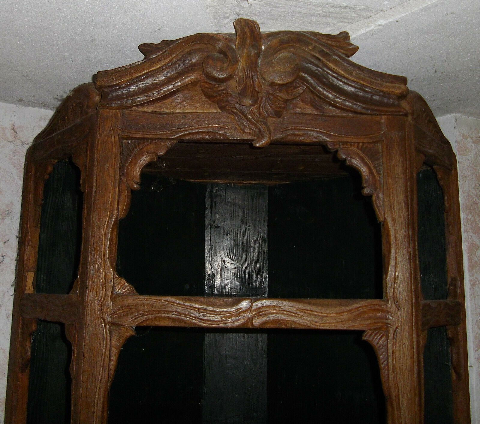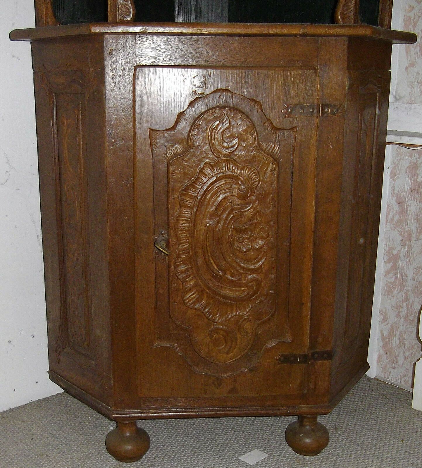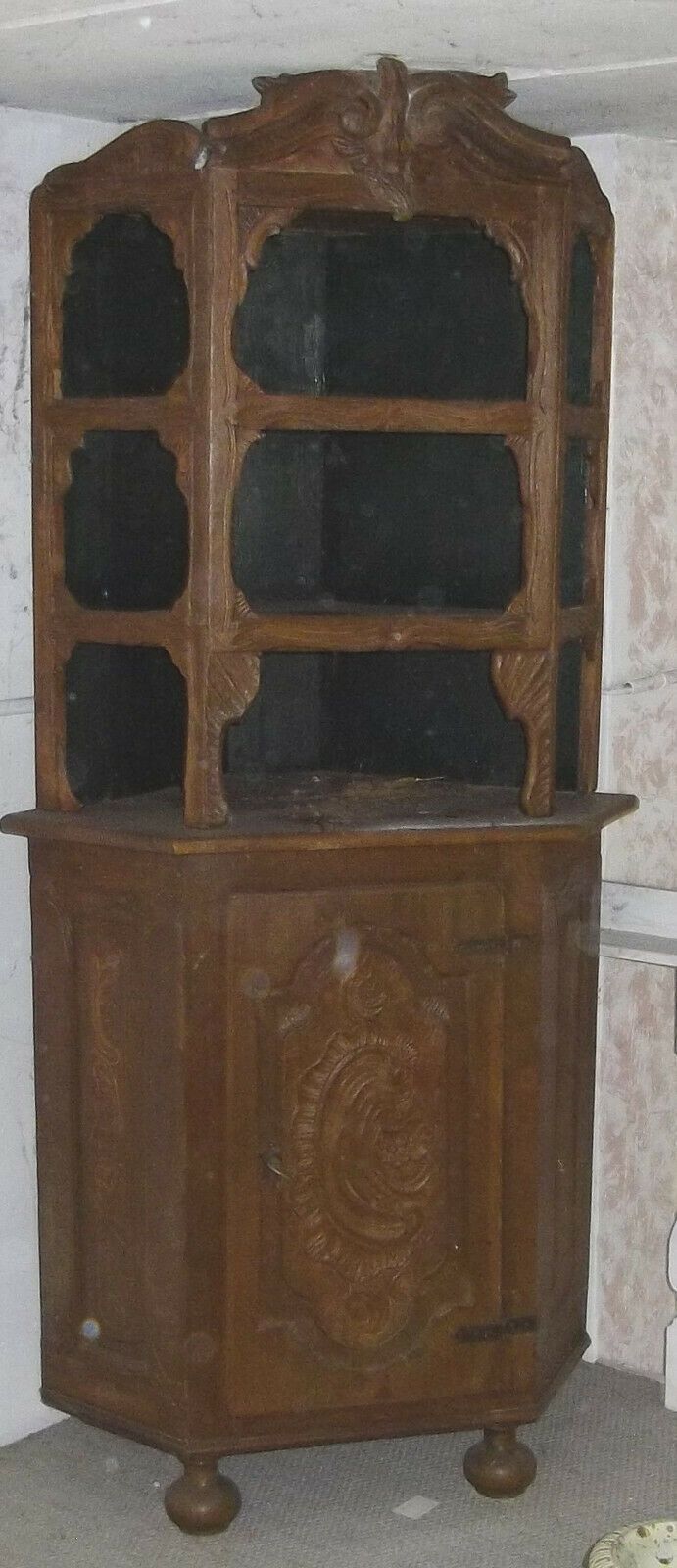 Eckschrank um 1800 (Barock). Herkunft: Deutschland. Material: Eiche innen bemalt. Das Möbel ist besteht aus Unter- und Oberteil. Das Oberteil ist vollkommen offen, also ohne Glas! An der Verzierung oben rechts fehlt ein Stückchen! Maße: H 180, B 65, Schenkeltiefe 46 cm. Lieferung im Umkreis von 20 k