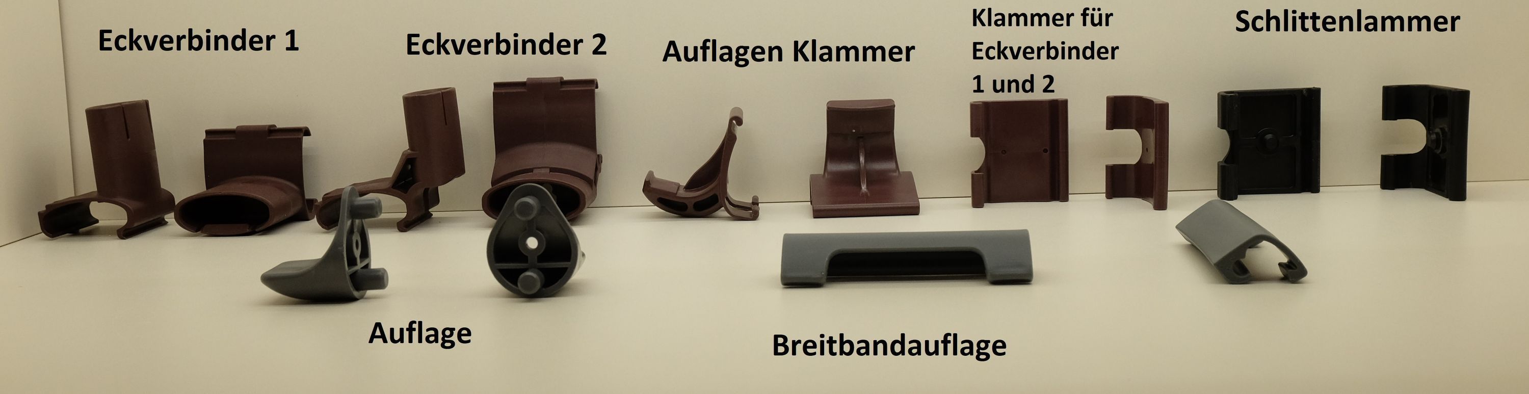 Eckverbinder 1, Eckverbinder 2, Auflagenklammer, Klammer für Eckverbinder 1 und 2, Schlittenklammer, Auflage, Breitbandauflage