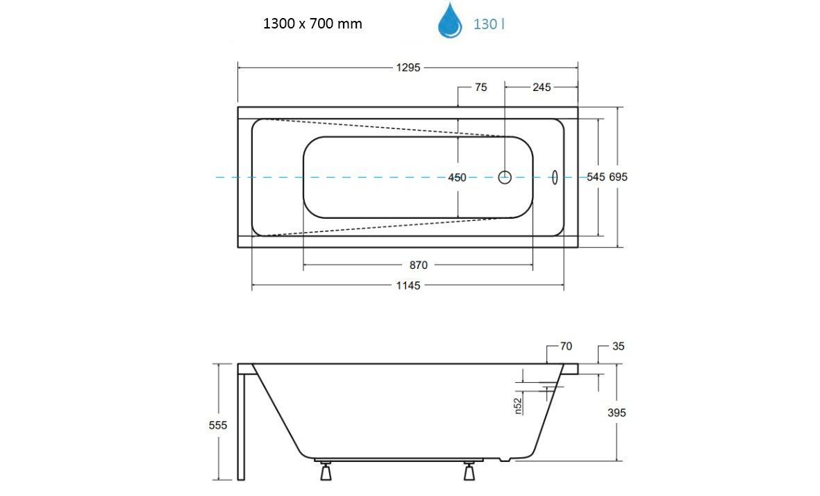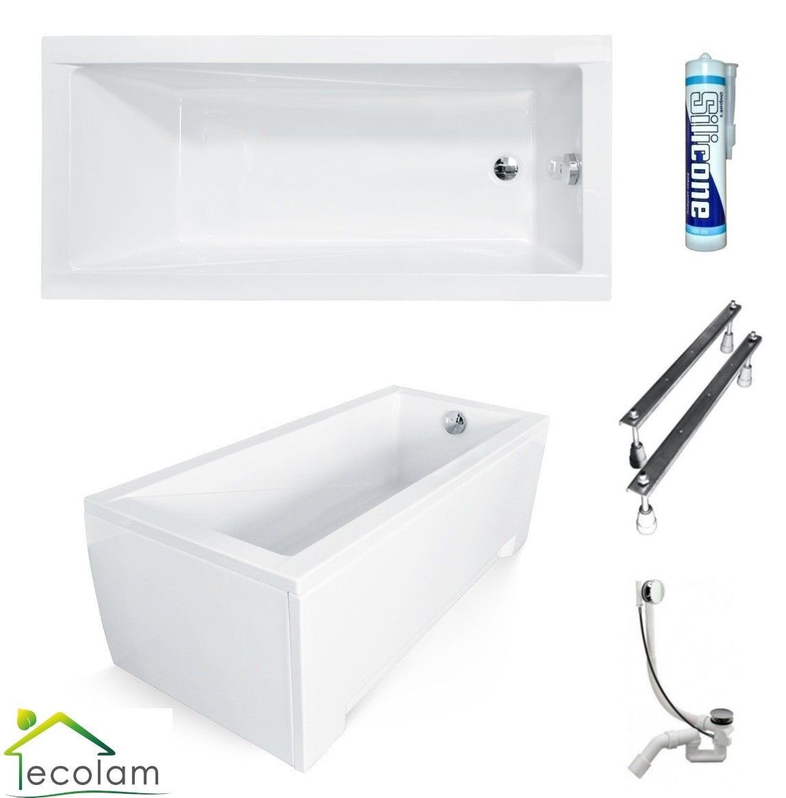 ECOLAM Badewanne 130x70 Modern Acrylwanne Rechteck Füße Ablaufgarnitur Silikon GRATIS