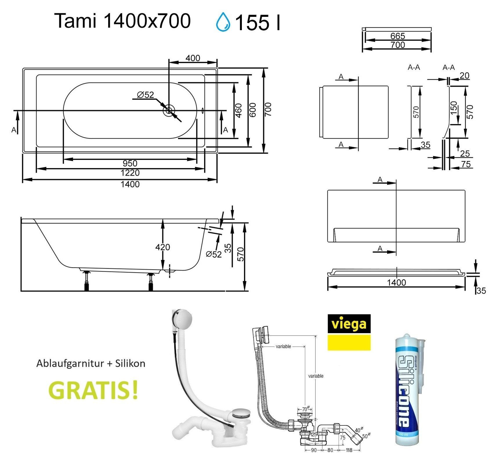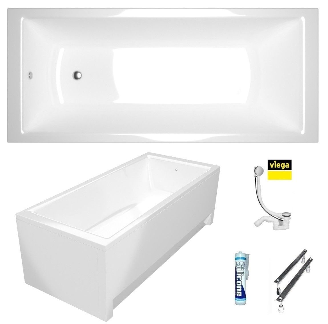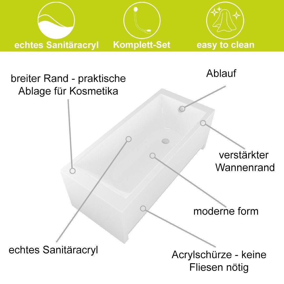 ECOLAM Badewanne 140 150 160 170 x 70 TAMI Wanne Rechteck Schürze Füße Siphon Viega