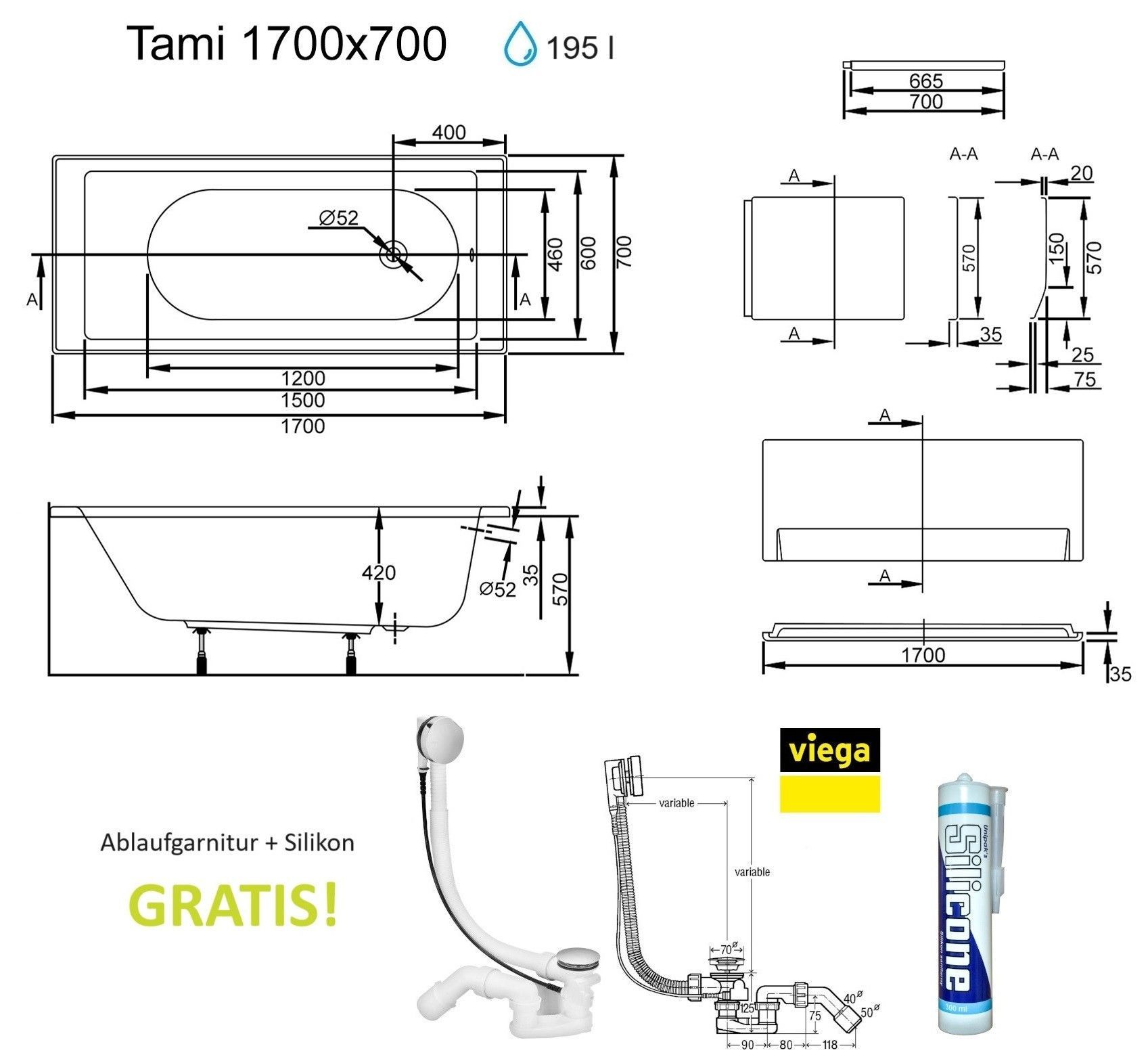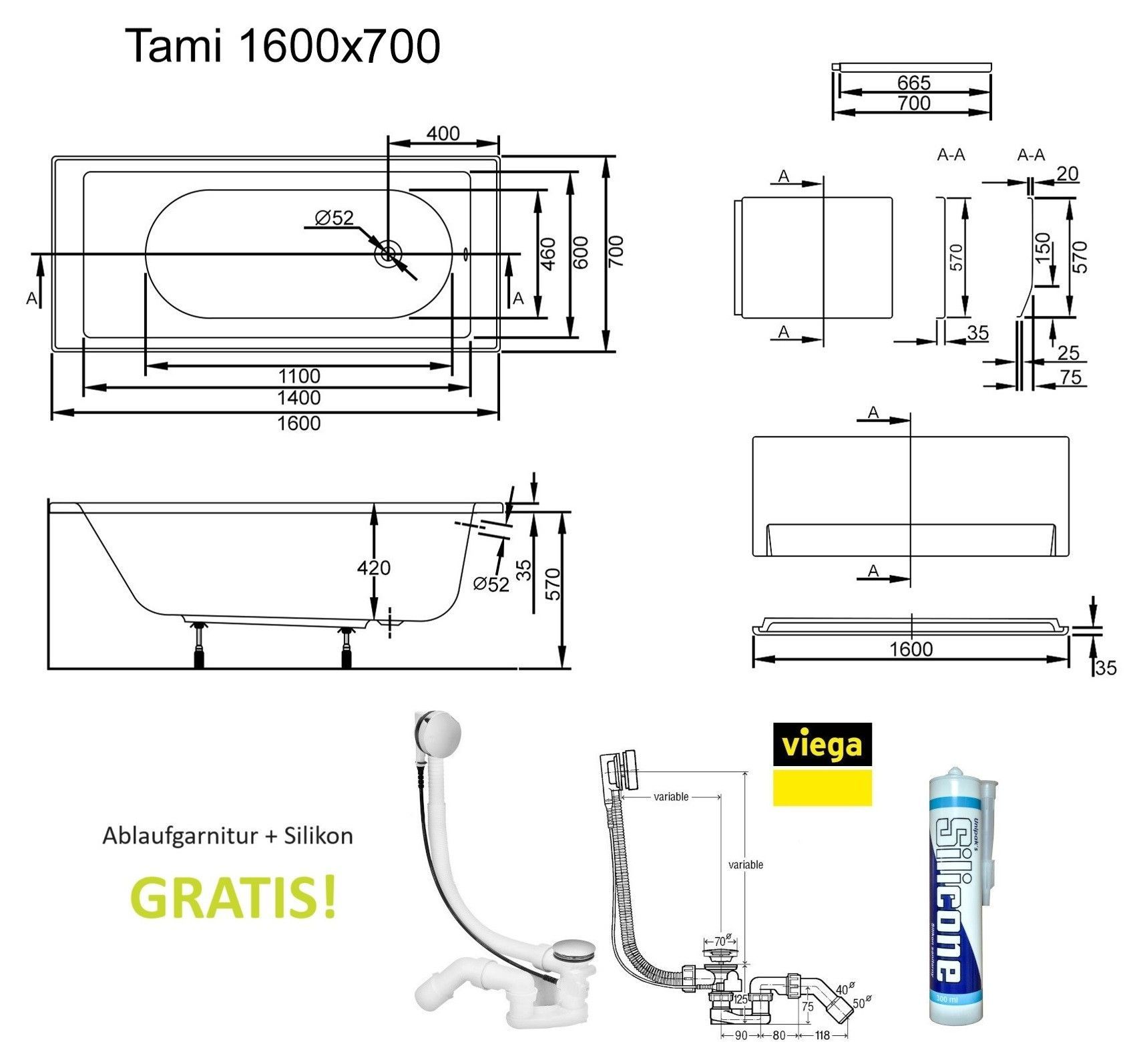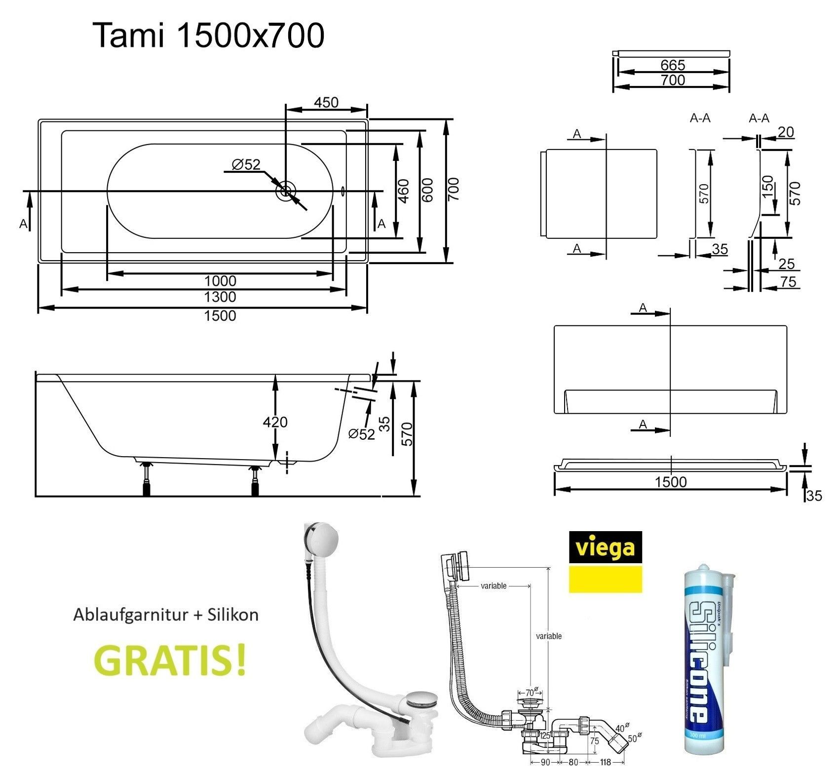 ECOLAM Badewanne 140 150 160 170 x 70 TAMI Wanne Rechteck Schürze Füße Siphon Viega