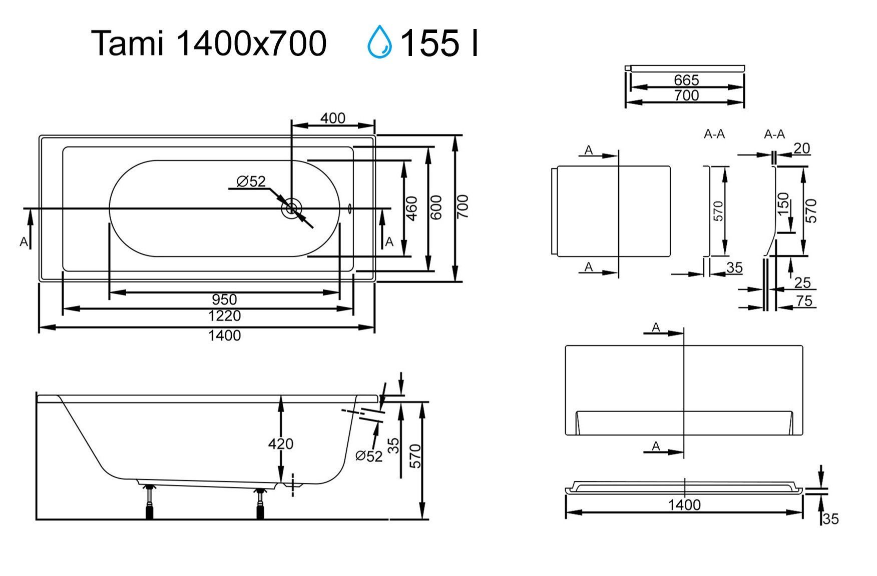 ECOLAM Badewanne 140x70 cm TAMI Acrylwanne Wanne Rechteck Schürze Füße Siphon Viega