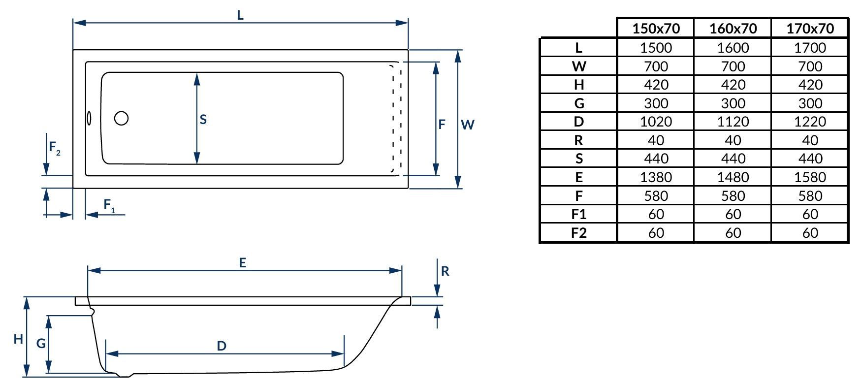 ECOLAM Badewanne 150x70 cm Marella Wanne Rechteck Schürze Ablaufgarnitur VIEGA