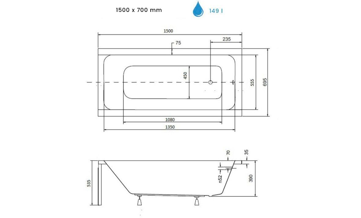 ECOLAM Badewanne 150x70 Modern Acrylwanne Rechteck Füße Ablaufgarnitur Silikon GRATIS