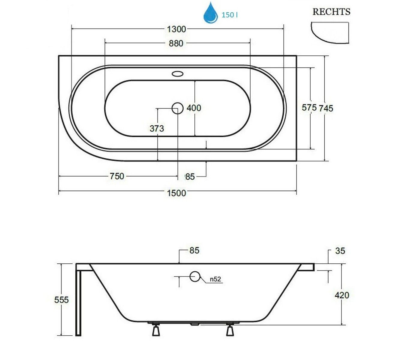 ECOLAM Badewanne 150x75 cm Avita Eckwanne rechts Acrylwanne Schürze Siphon Silikon