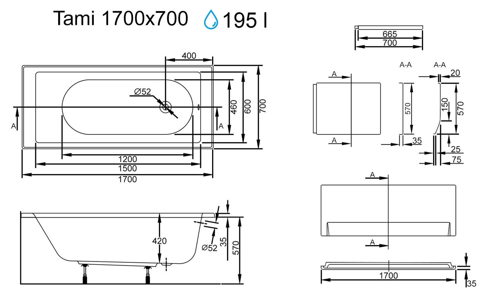 ECOLAM Badewanne 170x70 TAMI Antirutsch Acrylwanne Wanne Rechteck Schürze Füße Siphon