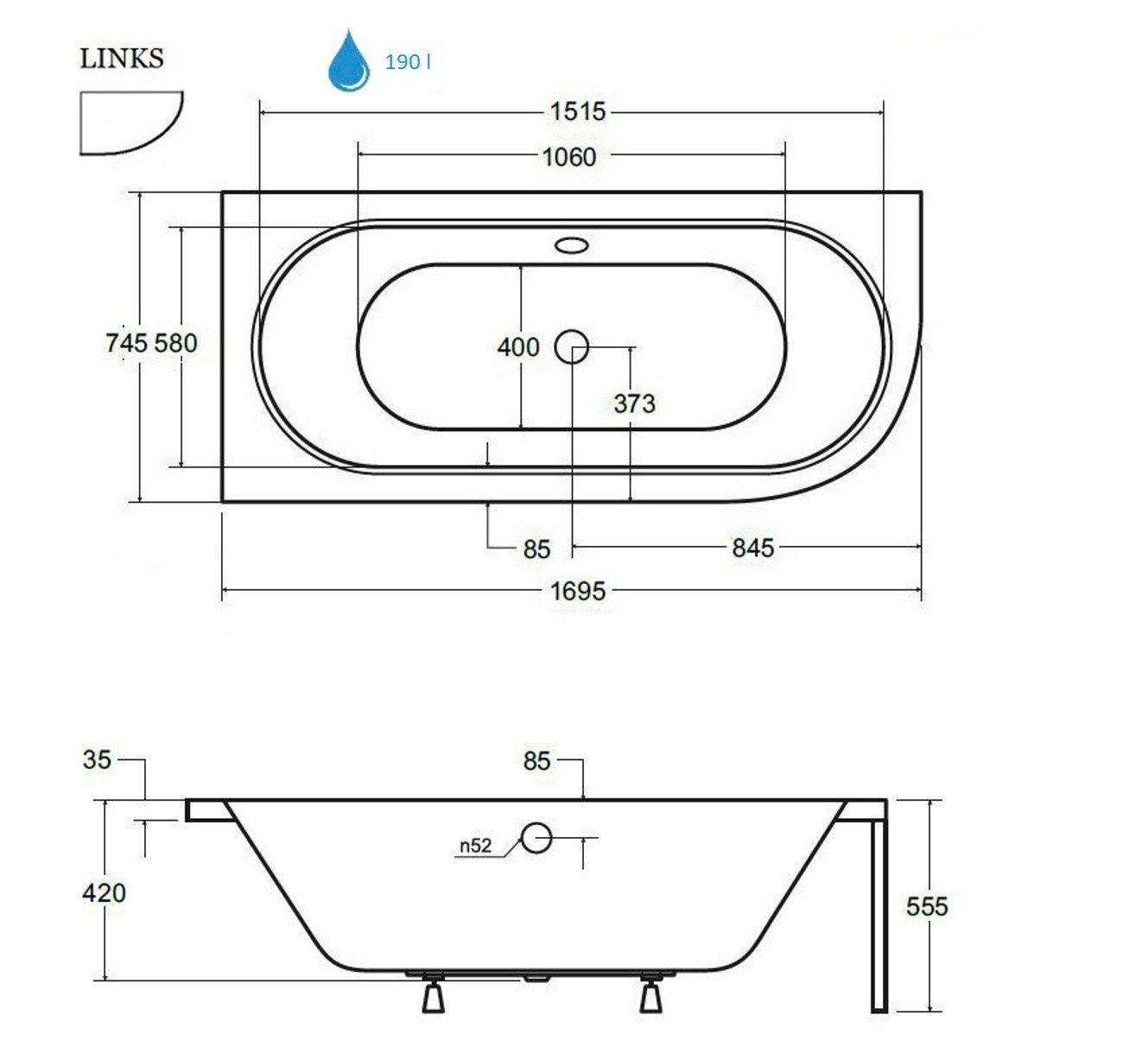 ECOLAM Badewanne 170x75 Avita Eckbadewanne links Acrylwanne Füße Siphon SilikonGRATIS