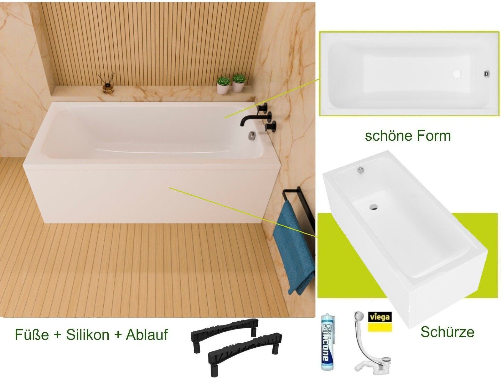 ECOLAM Badewanne 170x75 cm Basic Wanne Rechteck Schürze Ablaufgarnitur VIEGA