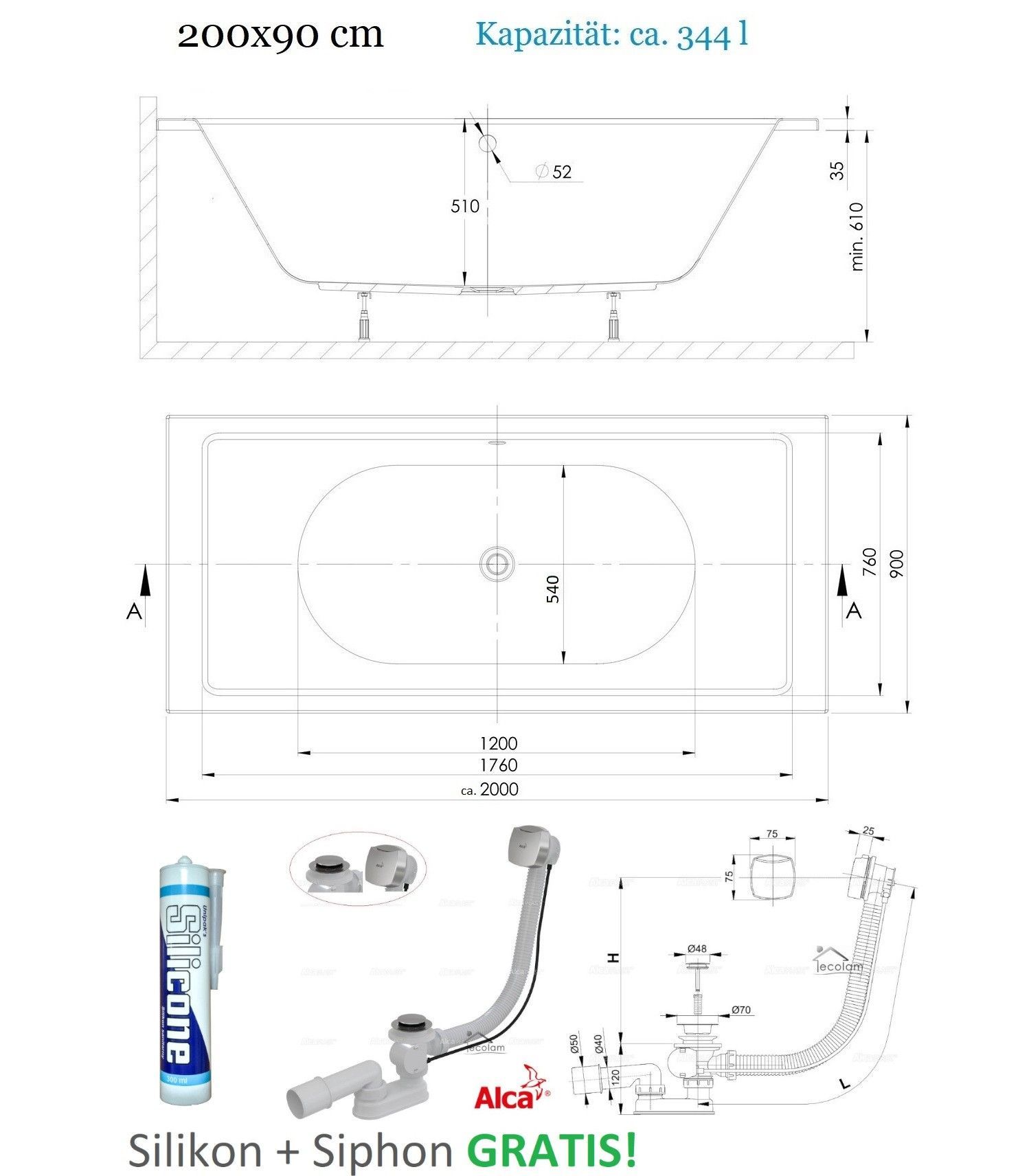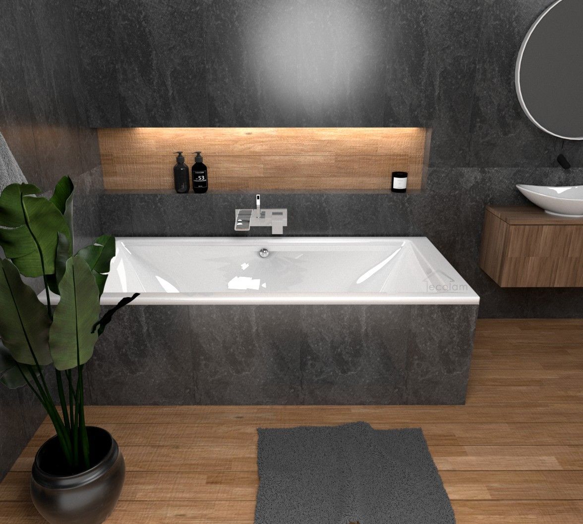ECOLAM Badewanne 200x90 TAMI Acrylwanne für Zwei Wanne Styroporverkleidung + Siphon