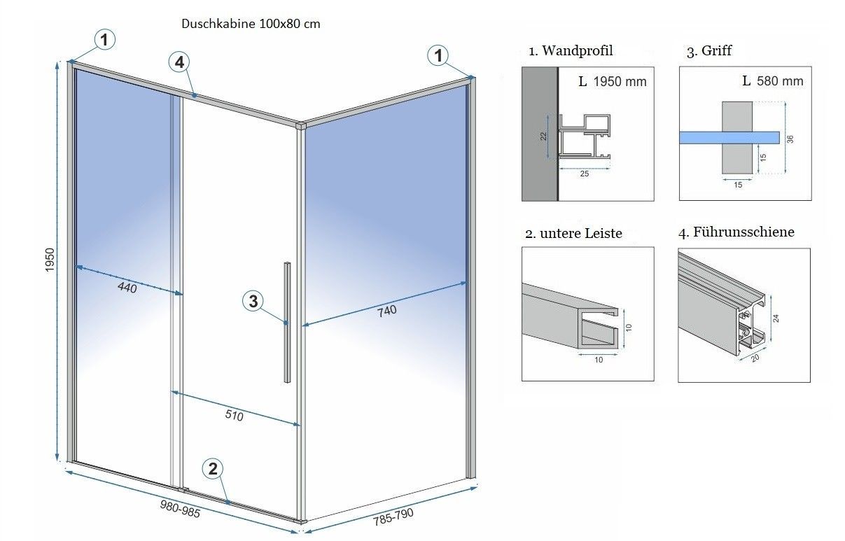 ECOLAM Duschkabine 100x80 195 cm Solar gold bodengleich Dusche Klarglas transparent