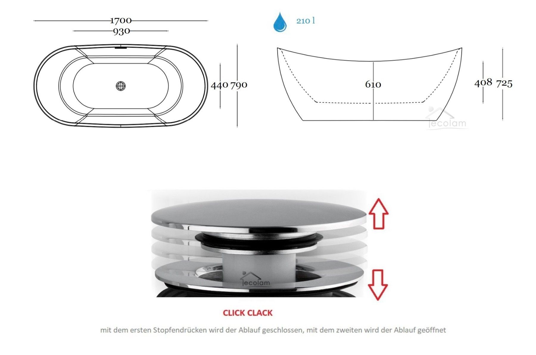 Lieferumfang STANDBADEWANNE ACRYLWANNE CLARA + BADEWANNENBRETT Bambusablage - Relax im Bad mit Buch, Kosmetika oder Film freistehende Badewanne Clara 170 x 80 cm Füße Bambusablage Ablaufgarnitur Click Clack mit Überlaufgarnitur GRATIS! KOSTENLOSER VERSAND INNERHALB DEUTSCHLANDS HERSTELLERGARANTIE Li