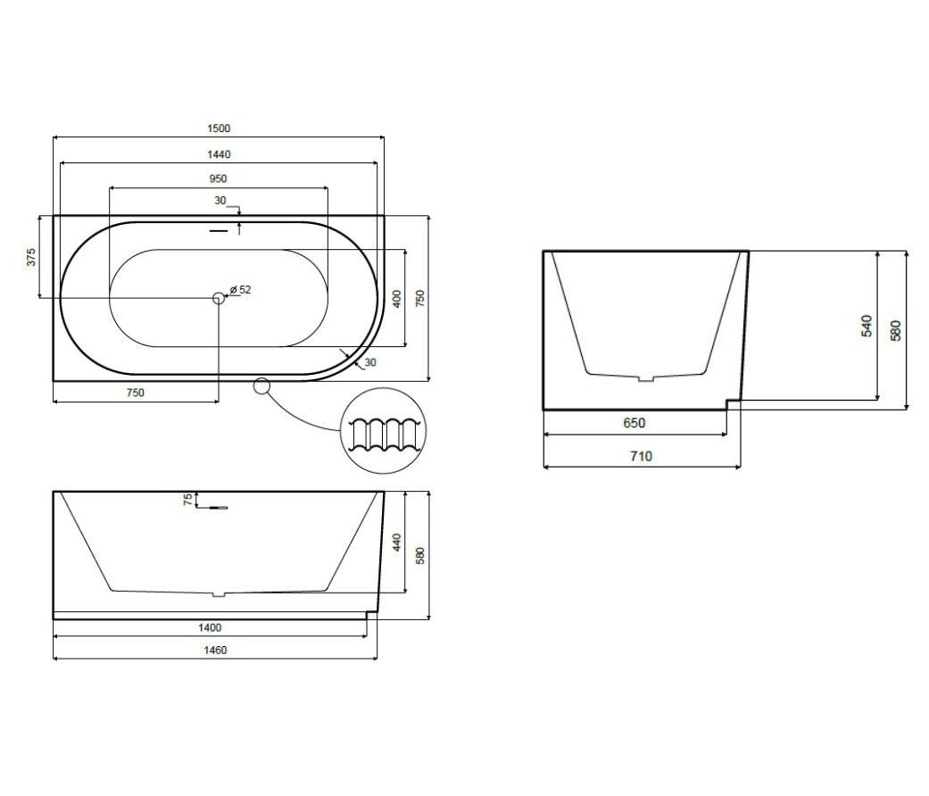 ECOLAM freistehende Badewanne Halb-Freistehend 150x75cm links Wandbadewanne Denaya