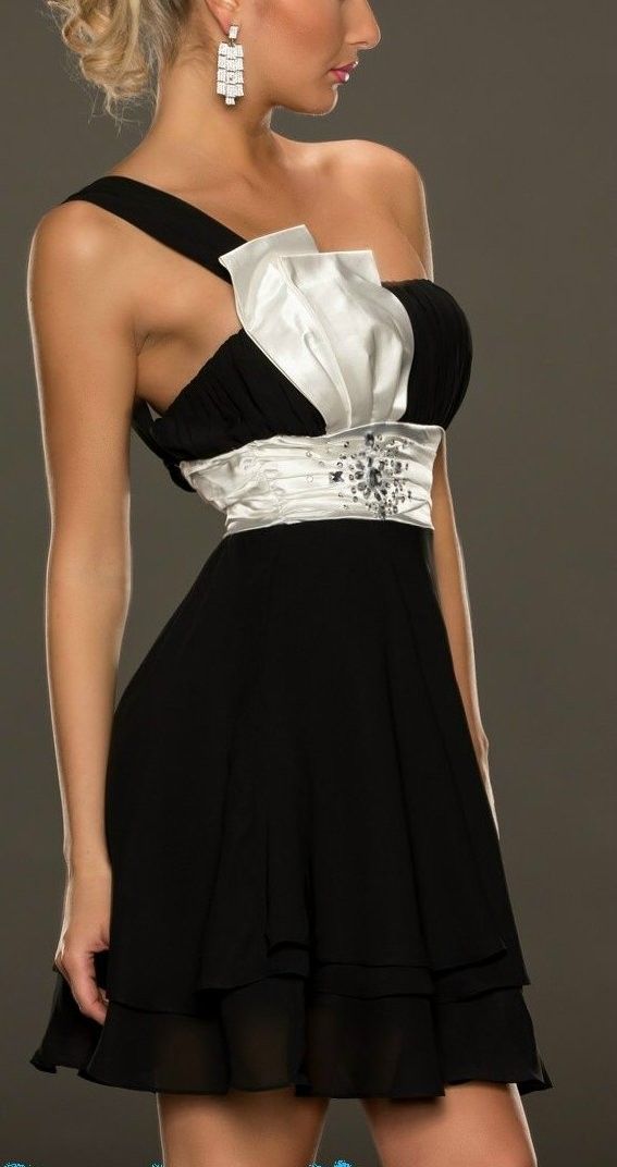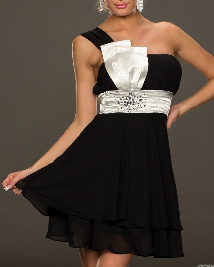 Traumhaftes Chiffon Mini Kleid One Shoulder Träger Dress gerade Push up Dekollette figurbetont tailliert Unterbrustband im glänzigen gerafften Satin Desing edel mit Glitzer Strass Steinen Verziert mit auf Träger Seite Satin Stoff Verzierung im Taillenbereich besetzt ausgestellter mehrlagiger Chiffon
