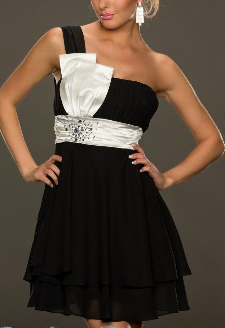 Edel Damen Cocktail Abend Kleid Chiffon Satin Strass Steine 34 36 schwarz weiß