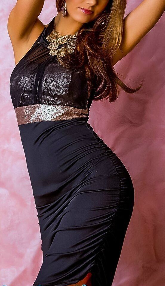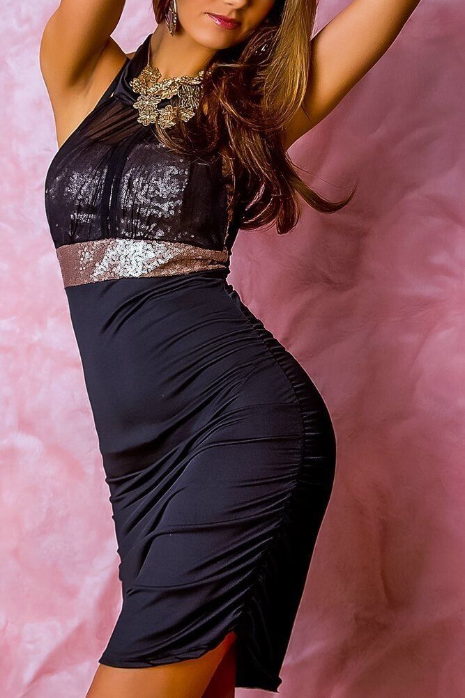 Edel Damen SeXy Mini Kleid Glitze Dress schwarz gold Chiffon Pailletten 34/36/38