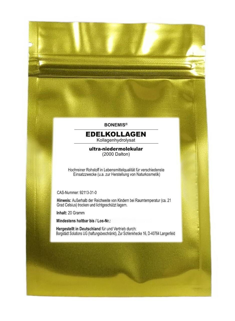 Wir liefern ab 30,- Euro Warenwert innerhalb von Deutschland versandkostenfrei ! Edelkollagen (Anti-Aging-Creme selber machen), Rohstoff für Naturkosmetik, 20 g im Beutel Hochwertiges, ultra-niedermolekulares Edelkollagen in Pulverform. Das Molekulargewicht beträgt lediglich 2 kDa (2000 Dalton). Ein