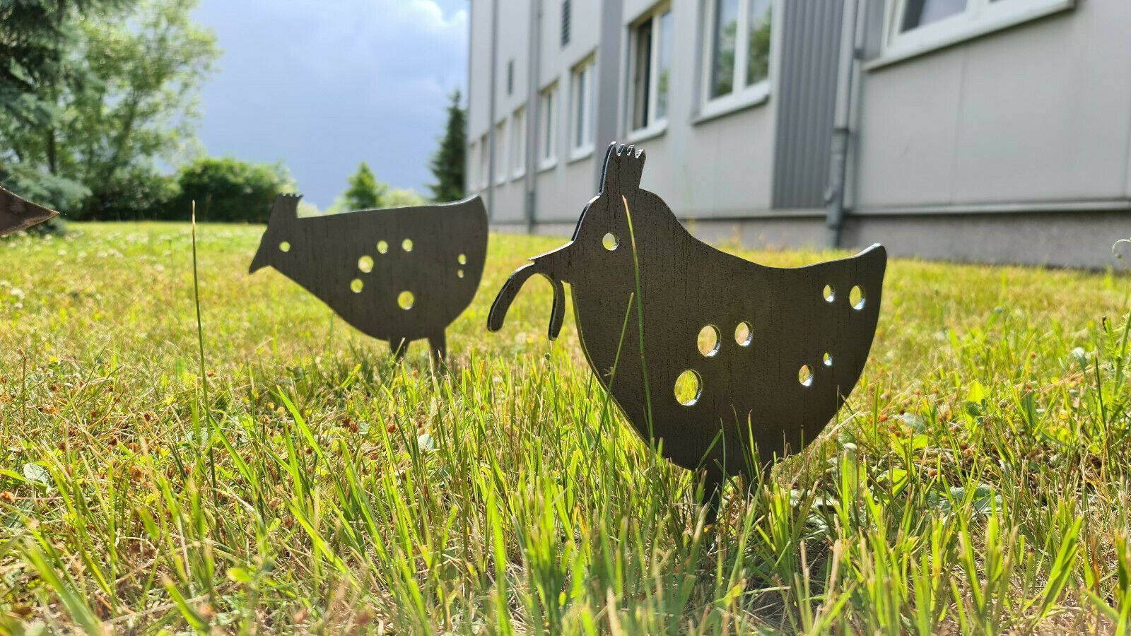 gelasert aus Stahlblech Wird metallisch blank geliefert, Rost kommt von selbst im Freien, eventuell mit Salznebel besprühen um gewünschten Effekt schneller zu erreichen Material: S235, Stärke: 3mm, Abmessungen ungefähr 20x20cm (1xHuhn)