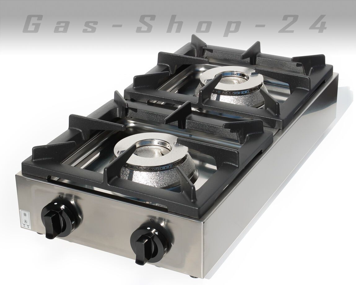 Hochwertiger 2 flammiger Gastrobrenner in Edelstahl 18 10 mit Zündsicherung und Zündbrenner . Dieser Profi-Gaskocher ist aus hochwertigen Materialien gefertigt und bietet durch seine hohe Leistung und Sicherheitausstattung vielseitige Anwendungsmöglichkeiten. !! Für den Einsatz im Innenraum zugelass