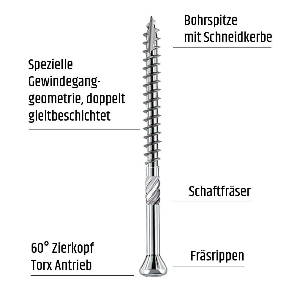 Edelstahl C1 Terrassenschrauben mit CUT-Spitze -LiSeKo 5 x 40-80mm Edelstahl Terrassenschraube Hartholzschraube gehärtet martensitisch 60° Zier-Senkkopf, Schaftfräser, Fräsrippen und Bohrspitze mit Schneidkerbe. Bestens geeignet für die Befestigung von Hartholzpaneelen Terrassendielen auf Holzunterk