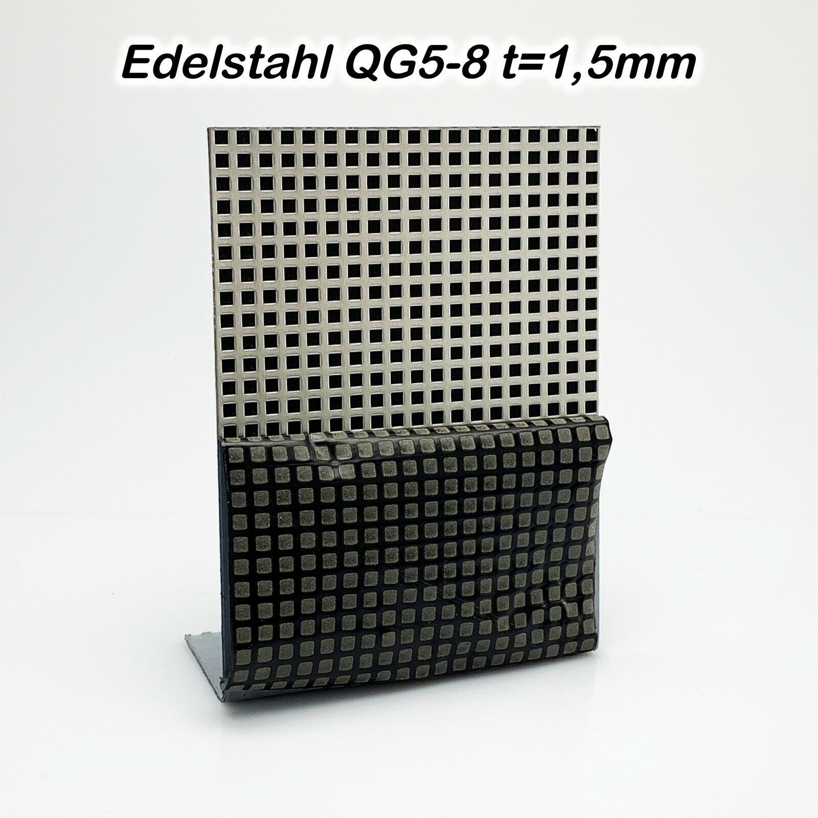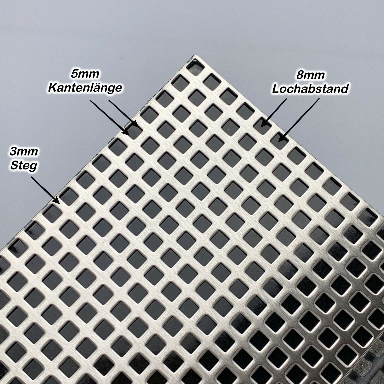 Vorteile Innen- und Außeneinsetzbar Rostfrei Stabil und korrosionsbeständig Dank kostenlosem Zuschnitt, vielseitig einsetzbar Einseitig Schutzfolie Kostenloser Rückversand innerhalb von 30 Tagen Material: Edelstahl K 240 Lochbild: QG 5-8 = quadratische Löcher, in geraden Reihen, Durchmesser 5mm, Loc