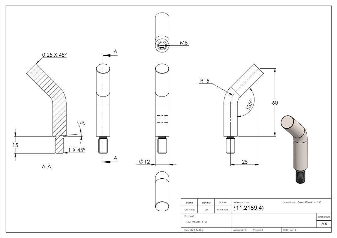 Edelstahl Trägerstift 135° gebogen Ø 12 x 60 mm - M8x15 / zum Anschweißen (V2A)