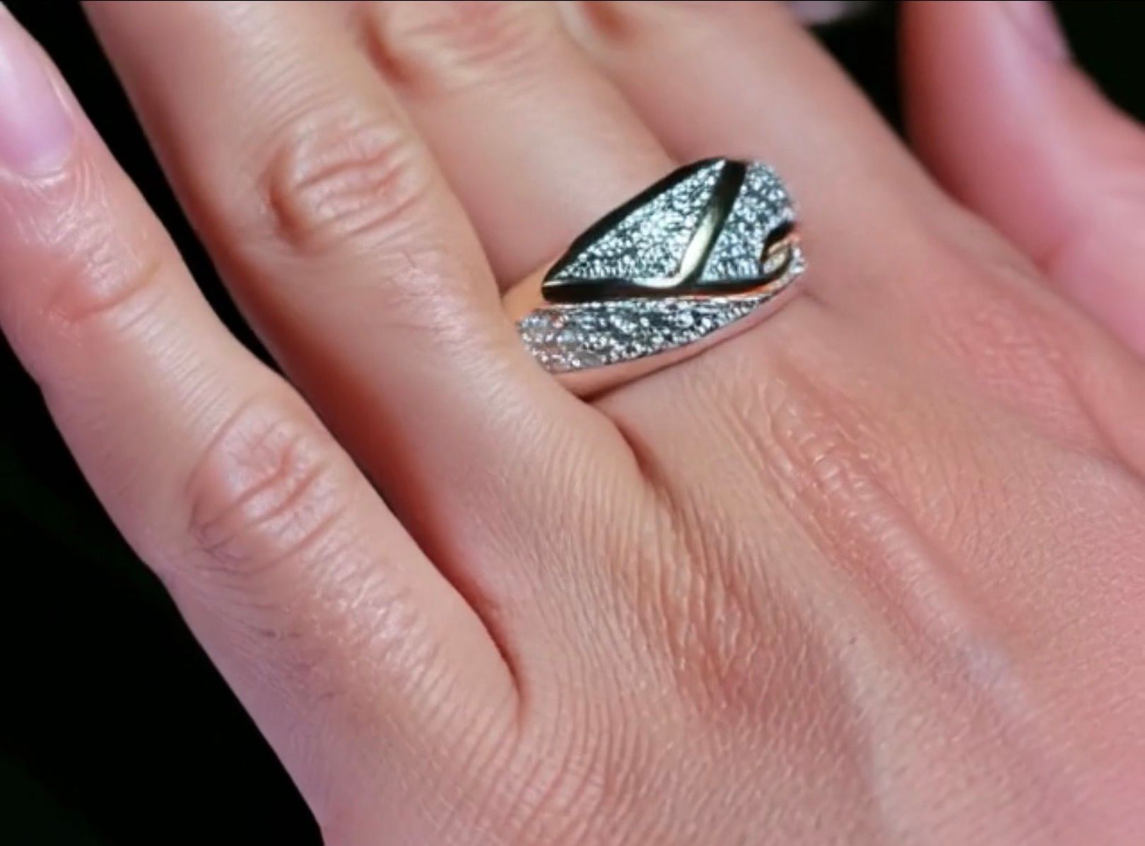 Massiven Designer-Bandring von GUEL. Ein echtes Highlight: Hochwertig rhodiniert für dauerhaften Glanz und mit unzähligen Zirkonia-Steinen besetzt. Elegante Gold-Akzente runden das edle Design ab. Größe: 53 (Ø 16,7 mm) Breite: ca. 10–12 mm Gewicht: Massive 11,9 g Zustand: NEU Ein luxuriöser Blickfang für jeden Anlass!