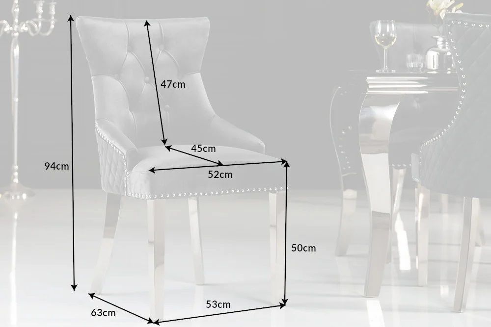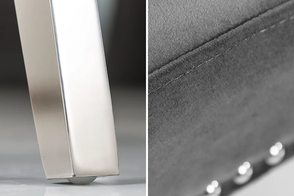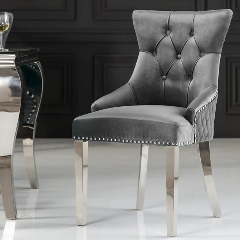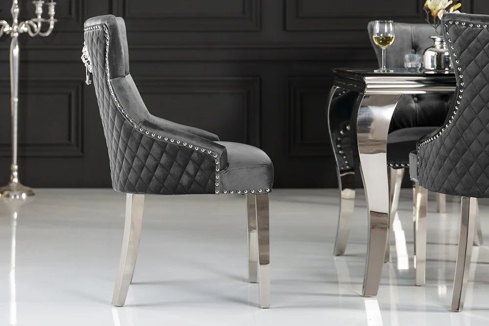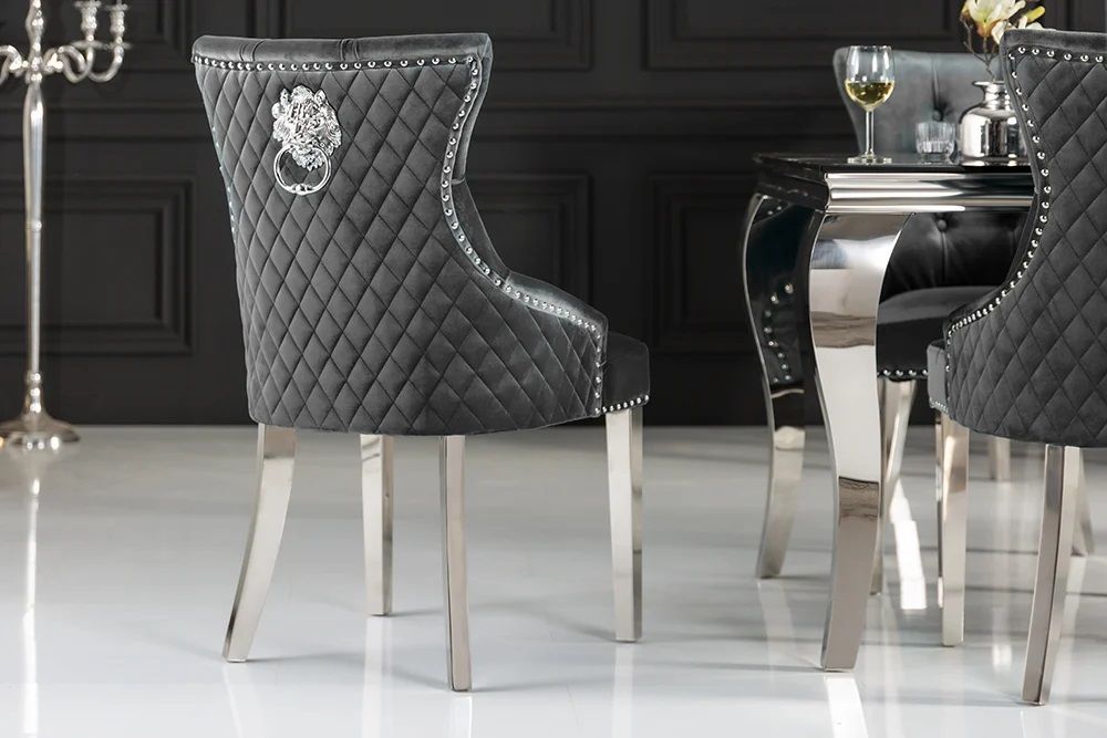 Edler Stuhl LEON Samt grau Löwenkopf Chesterfield Edelstahlbeine