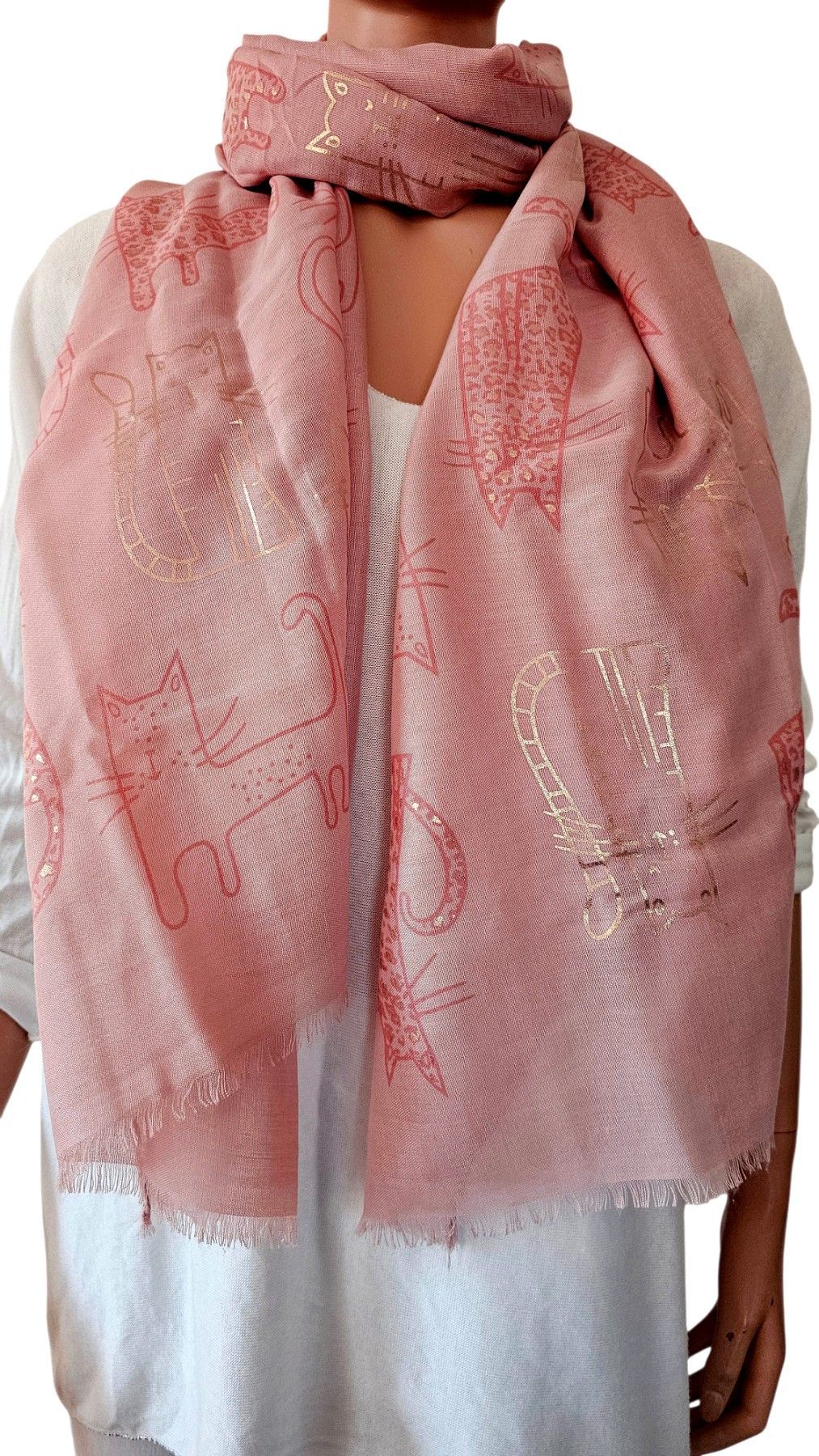 Edler XXL Schal Tuch Halstuch weiche Viskose Fransen Metallic Katzenprint in Rosa