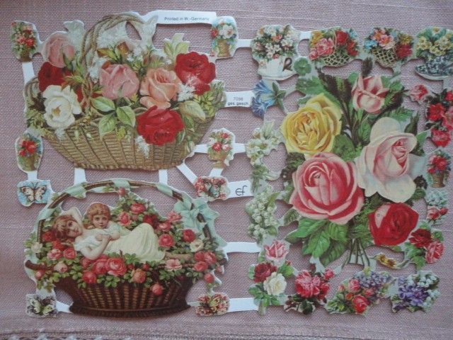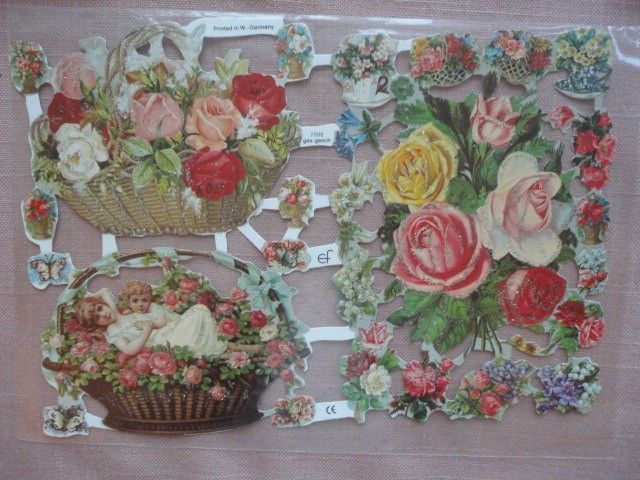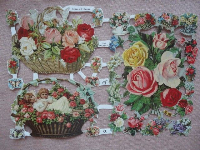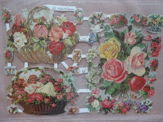 EF 7098 Glanzbilderbogen Ernst Freihoff printed in W-Germany Rosen Blumenkorb Kinder