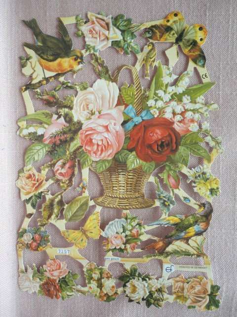 EF 7157 Glanzbilderbogen Ernst Freihoff - Rosenkorb Maiglöckchen Blumen