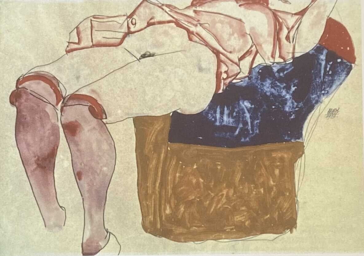 Lithographie Ruhende Frau mit lilafarbenden Strümpfen In der Platte signiert und mit der Hand nummeriert Limitierte Auflage von 200 Stück Jedes Stück ist einzeln nummeriert 64 200 Trockenstempel Geprägter Stempel von S.P.A.D.E.M. Paris Gesamtgröße : 50 cm x 70 cm Nach dem Original von Egon Schiele D