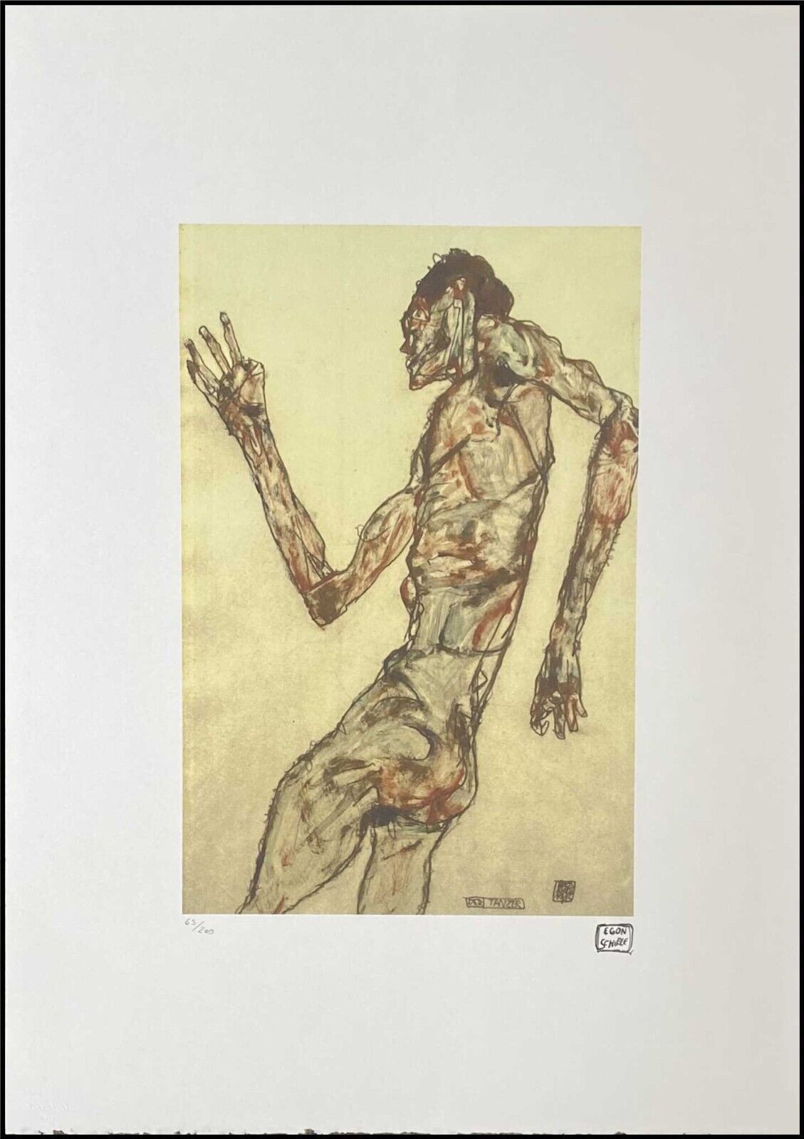 Lithographie Der Tänzer In der Platte signiert und mit der Hand nummeriert Limitierte Auflage von 200 Stück Jedes Stück ist einzeln nummeriert 65 200 Trockenstempel Geprägter Stempel von S.P.A.D.E.M. Paris Gesamtgröße : 50 cm x 70 cm Nach dem Original von Egon Schiele Das Blatt wird flach verschickt