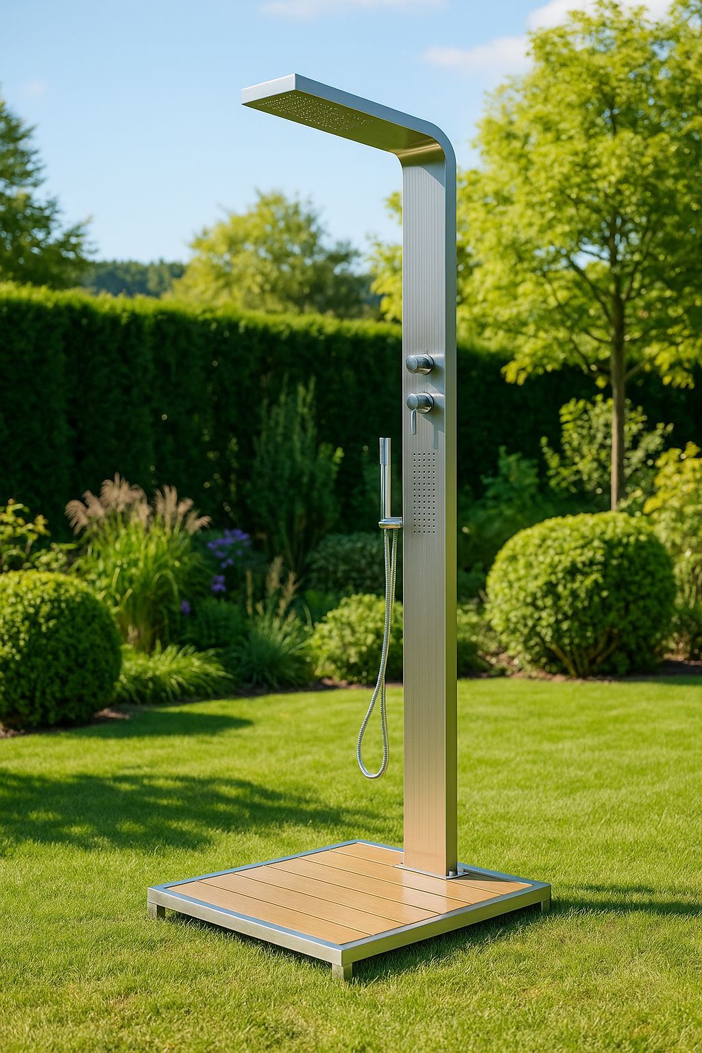 Eichenwald Modell 70 Gartendusche Elba mit WPC Plattform sandfarbig