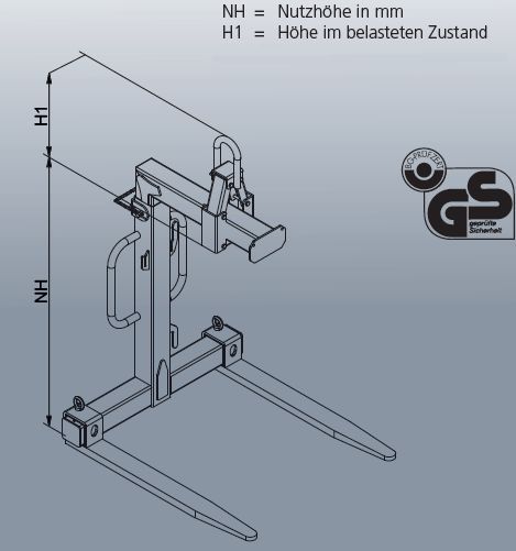 Stufenlos manuell verstellbare Weite der Zinken von 450 mm - 950 mm. Mit automatischem Gewichtsausgleich durch Zugfeder (wahlweise stufenlos manuell verstellbarer Tragring als Gewichtsausgleich) Verstellbare Nutzhöhe durch Absteckbolzen von 1150 - 1750 Ladegabel im Federausgleich Ausführung T D NH H