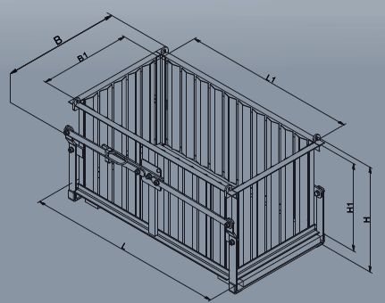 Mit Holzrost und Sicherung gegen selbstständiges Öffnen Mit Haken (wahlweise mit angeschweißter Kette) Ausführung: Inh. L B H L1 B1 H1 kg 1041.1 350 1200 710 690 1000 520 570 105 1041.2 440 1350 810 720 1180 620 600 120 1041.3 640 1350 810 1020 1180 620 900 135 1041.4 640 1500 810 940 1320 620 800 1