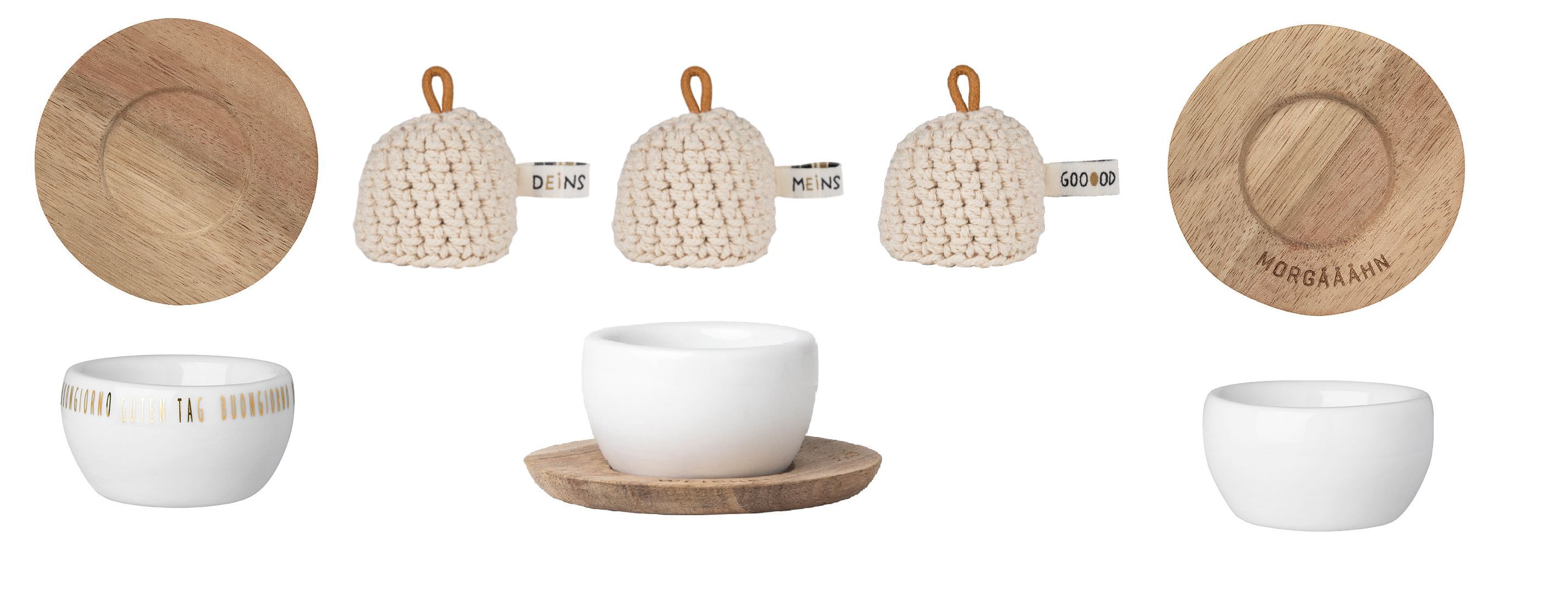 Eierbecher mit Unterteller 3er-Set mit 3 Mützen - Räder Design Damit das Ei noch besser schmeckt, serviert man es am besten im kleinen Porzellanbecher und dem dazu passenden handgefertigten Holzuntersetzer. Texte: Guten Tag , buon giorno , Morgääähn Mit drei zufällig ausgewählten Mützen. Material: P