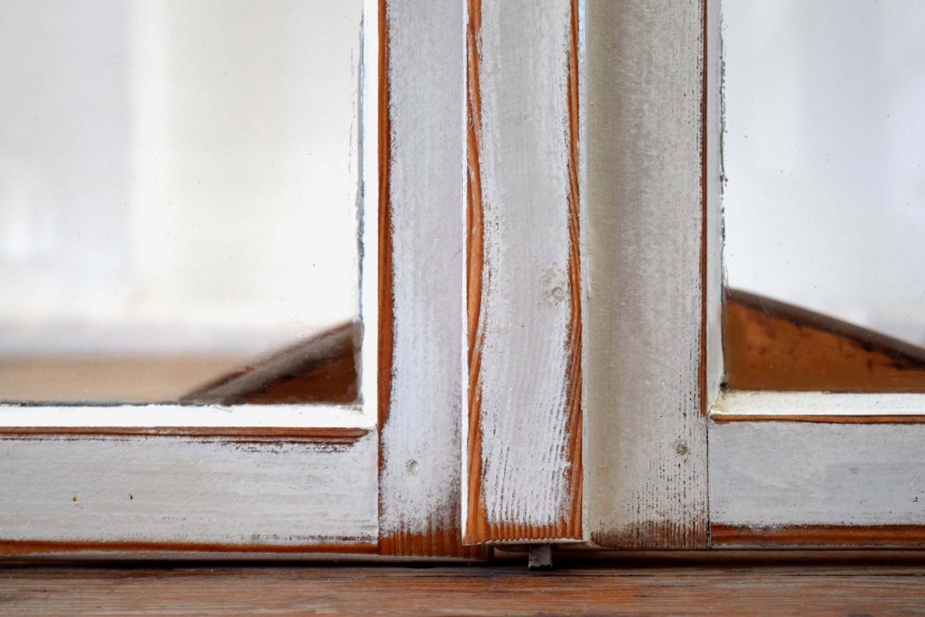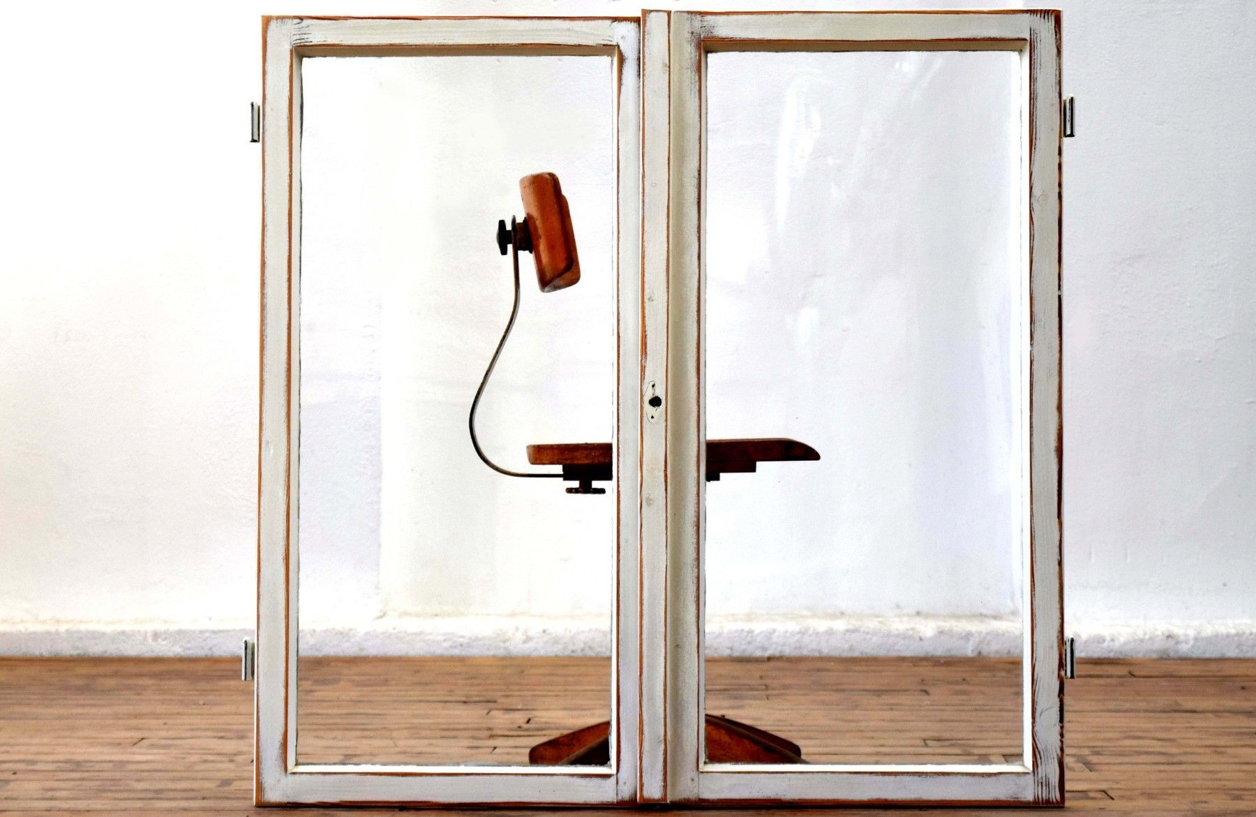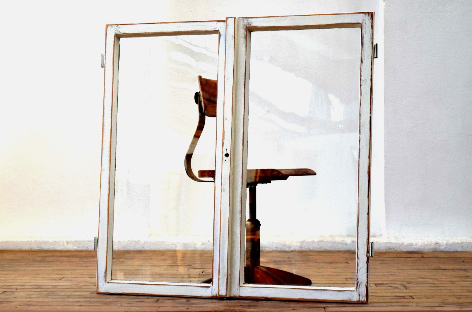 ein Paar (zwei Stück) historische Fensterflügel (um 1950) aus dickem Vollholz und Metall, heller Farbauftrag mit Shabby-Schliff mit Gebrauchspuren, schöner Zustand mit Scheiben aus Echtglas Maße je Flügel: Höhe 108cm, Breite 58cm, Tiefe 6cm, Gesamtbreite: 112cm kombiniert verwendbar (rechter und linker Flügel passen zueinander) Der Versand innerhalb Deutschlands ist kostenfrei und erfolgt per DHL Paket. Verkaufsgegenstand sind die beiden Fensterfügel als Paar.