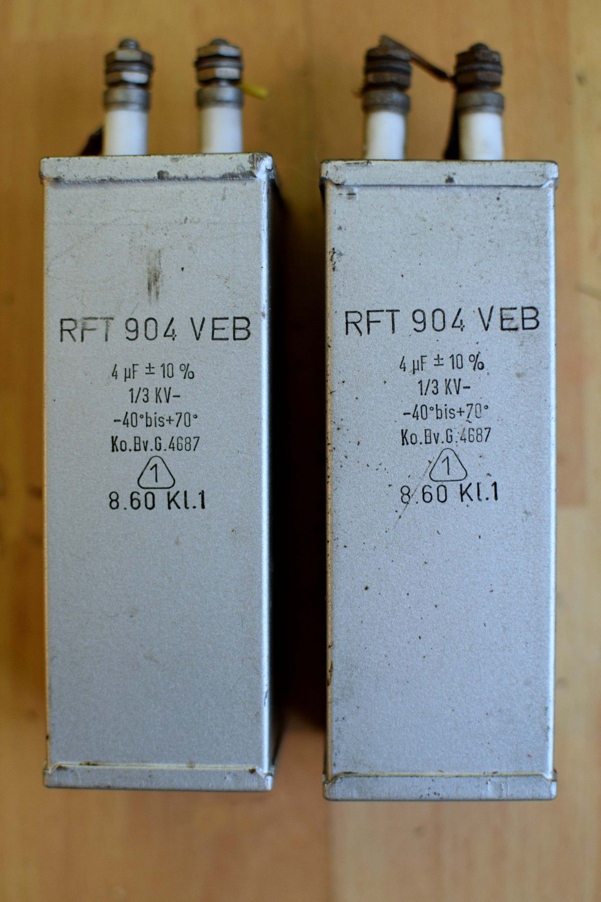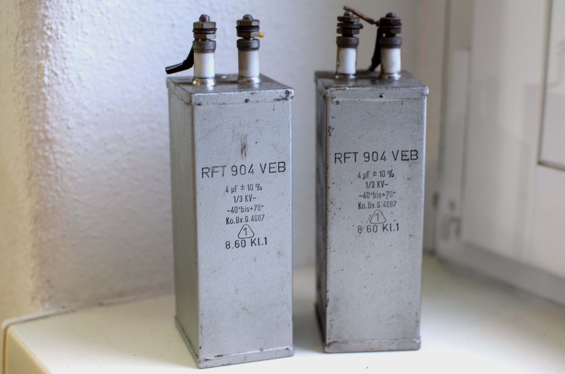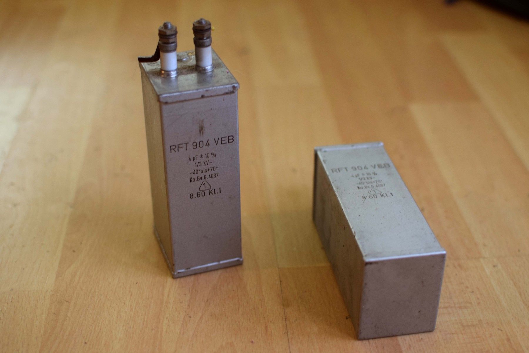 ein Paar (zwei Stück): Kondensator: MP RFT 904 VEB 4 uF 10% 1/3KV -40 bis +70 Ko.Bv.G 4687 aus der DDR mit Gebrauchsspuren, funktionsfähig Leistungsdetails, bitte den Fotos entnehmen Der Versand innerhalb Deutschlands ist kostenfrei und erfolgt per DHL Paket. Verkauf als Paar, Lieferumfang wie abgebildet.
