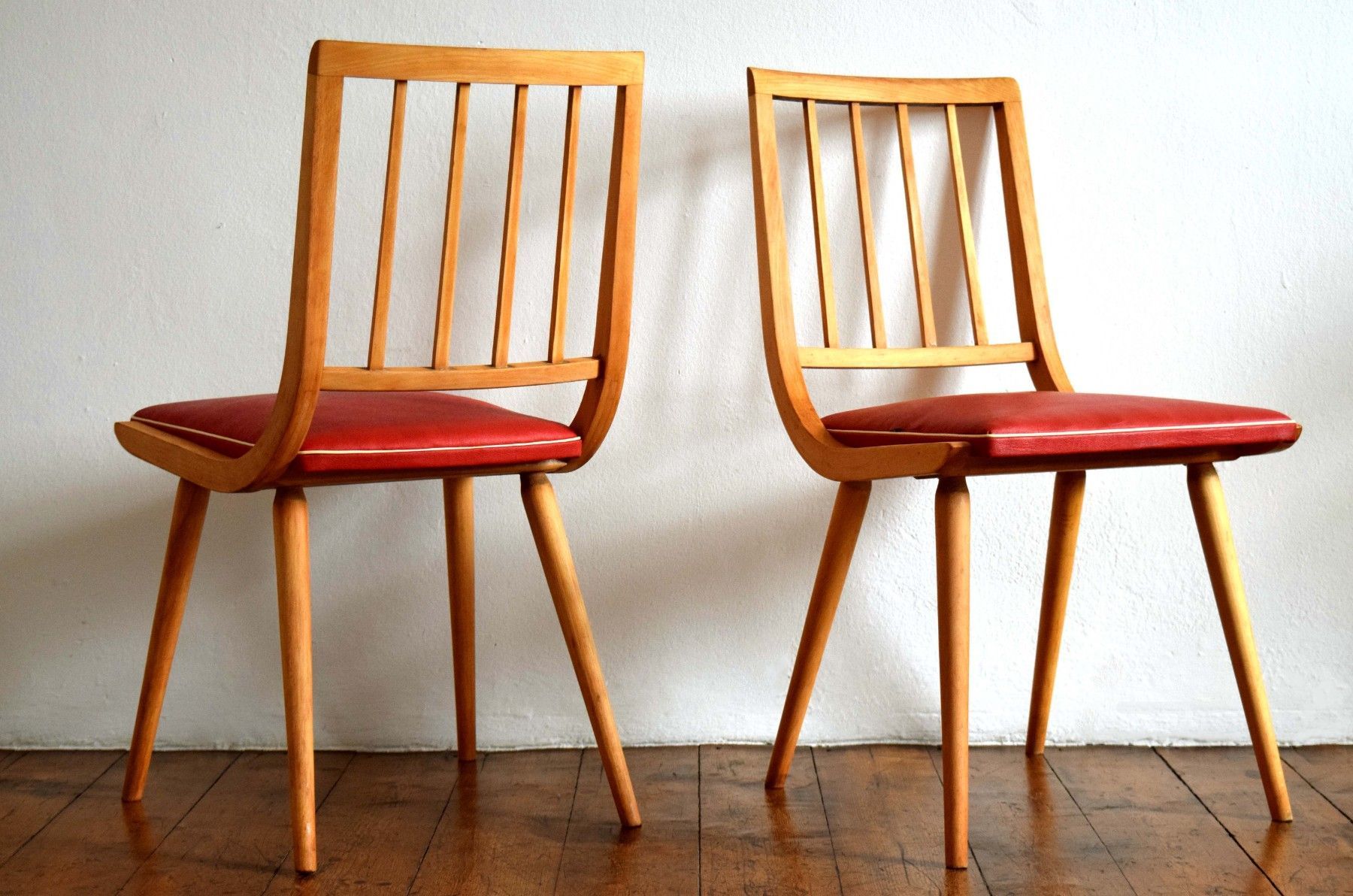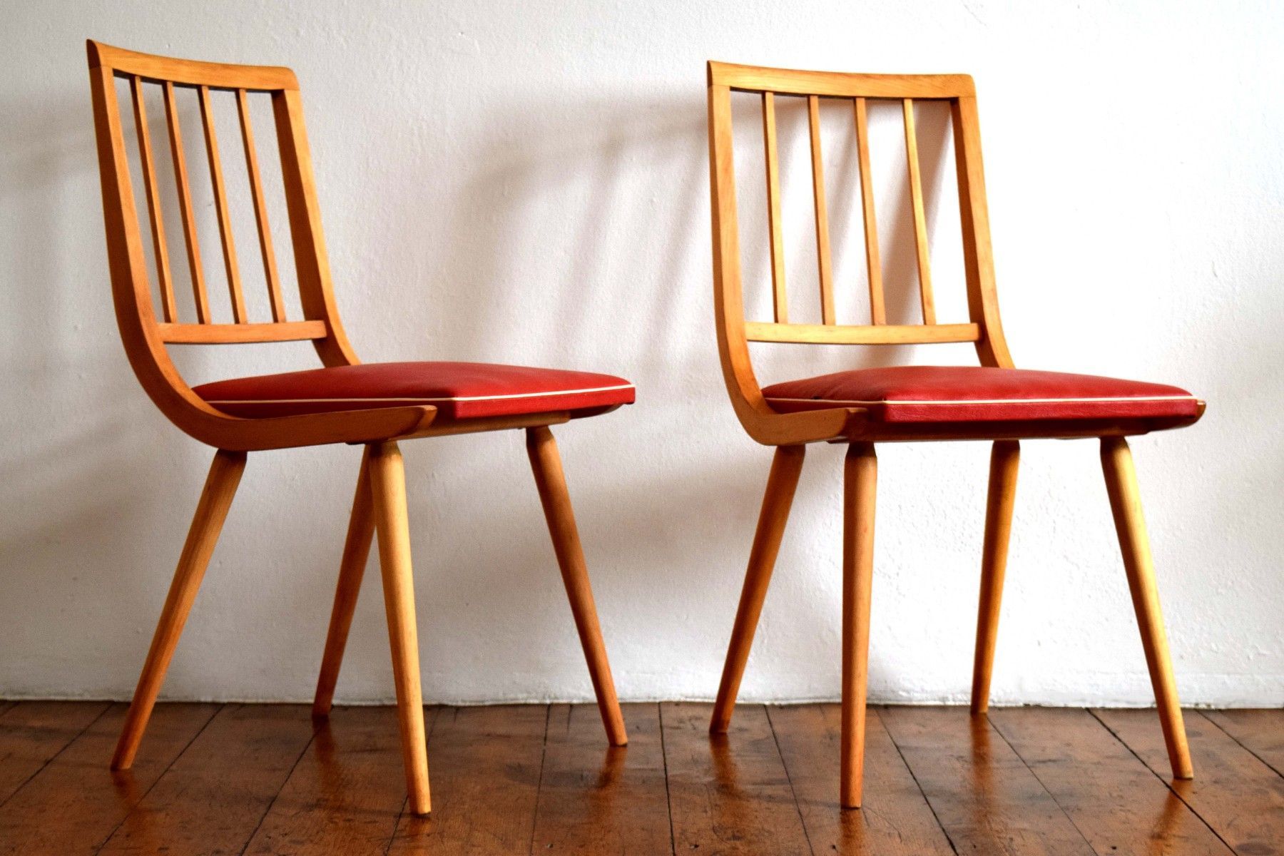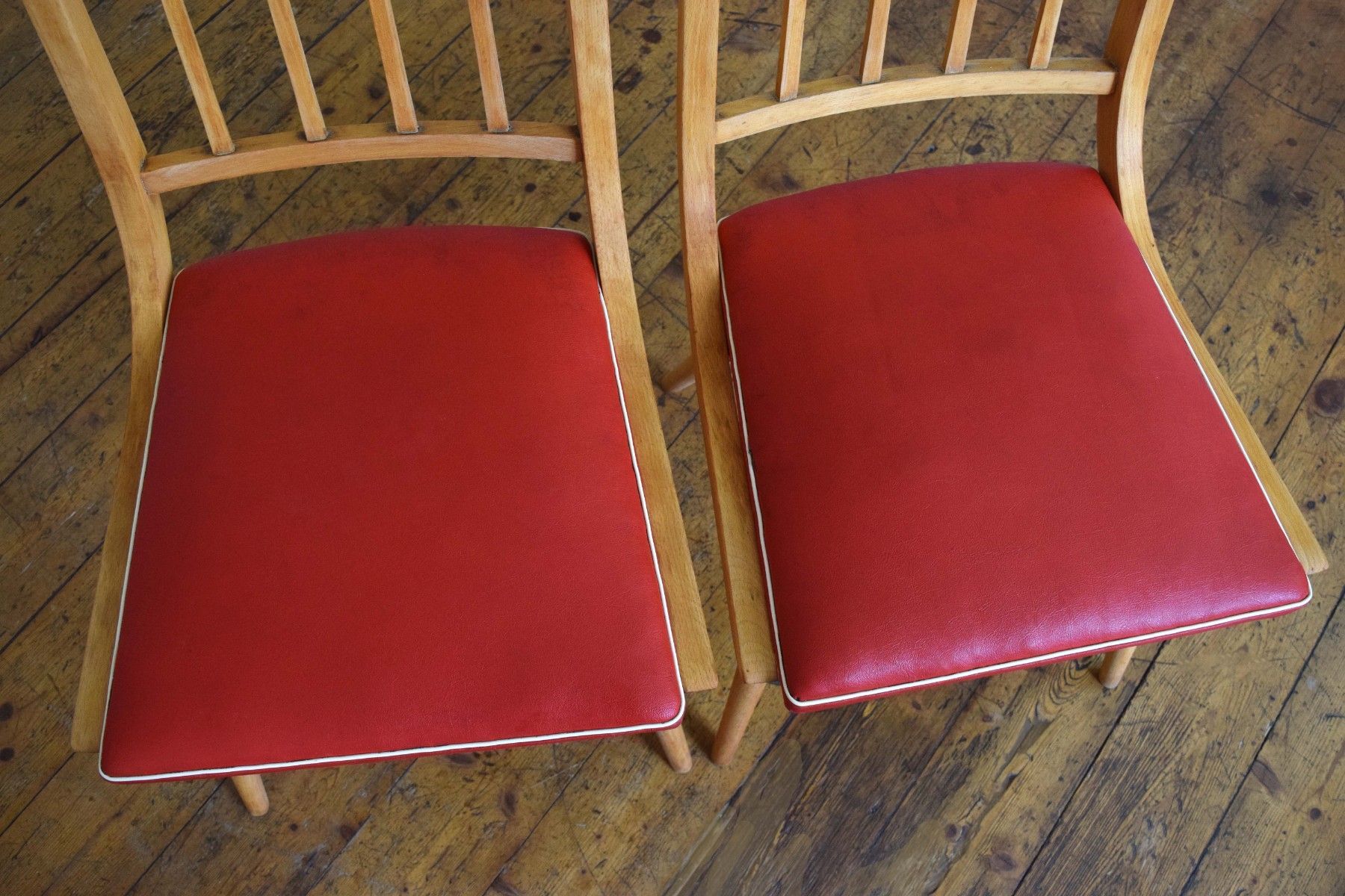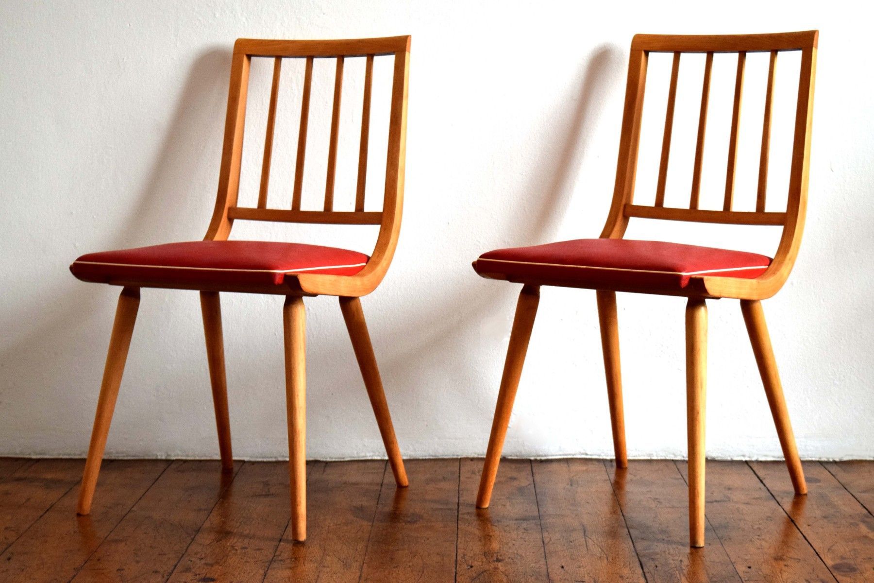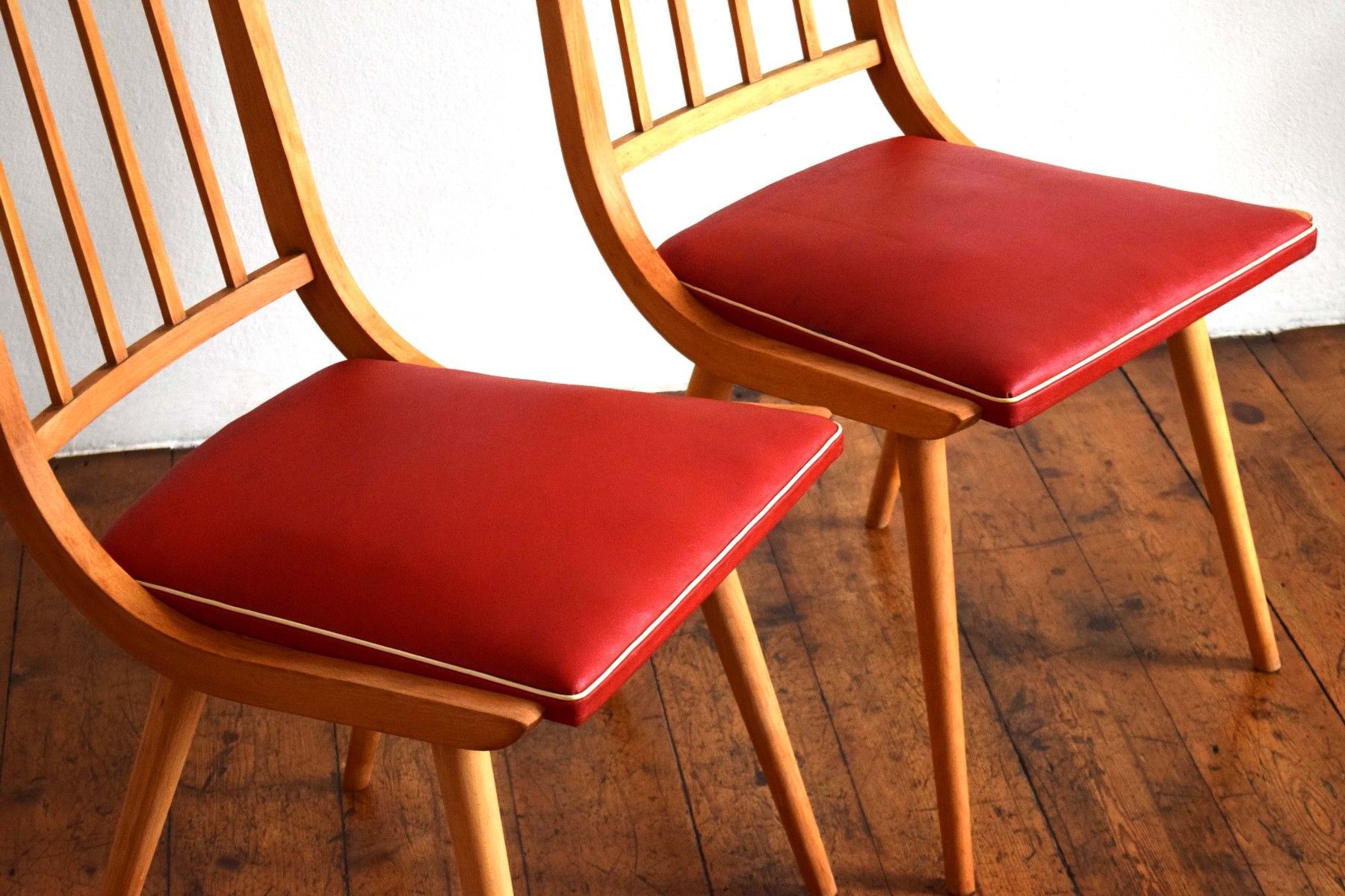 ein Paar (zwei Stück) historische Stühle (um 1960) aus Vollholz (Buche massiv), Sitzflächen Bezug aus Kunststoff (rot mit weißem Rand) guter Zustand, kräftige Farben, stabil und gepflegt, langfristig nutzbar einer der beiden Stühle hat eine kleine Öffnung am Rand des Bezuges (siehe Bild sieben und acht) Sitzhöhe 45, Lehnenhöhe 84cm, Breite 45cm, Tiefe 48cm Der Verkauf der beiden Stühle erfolgt als Paar.