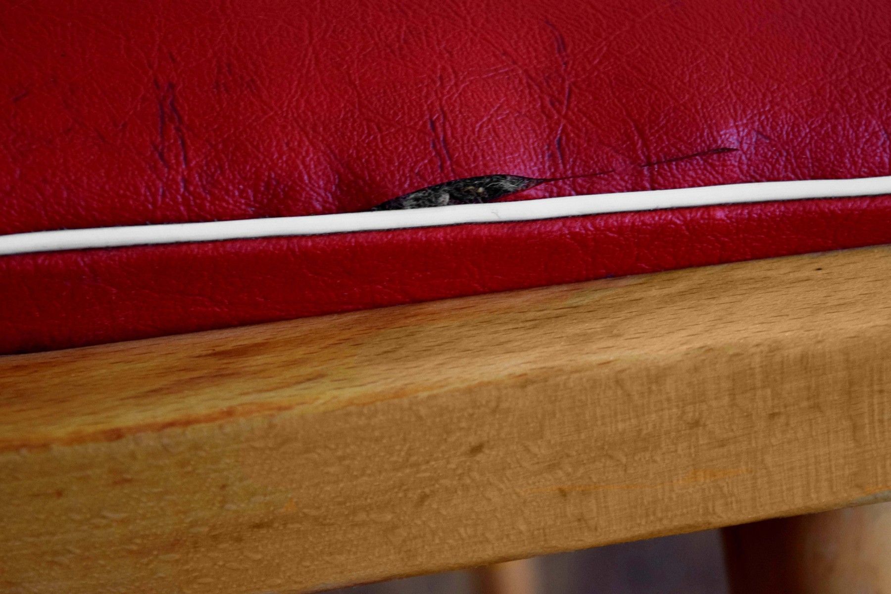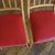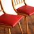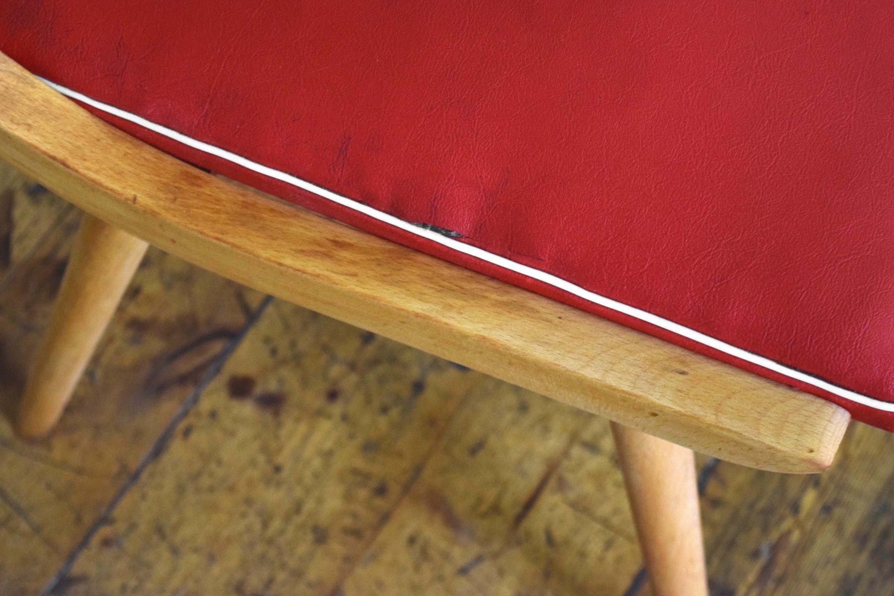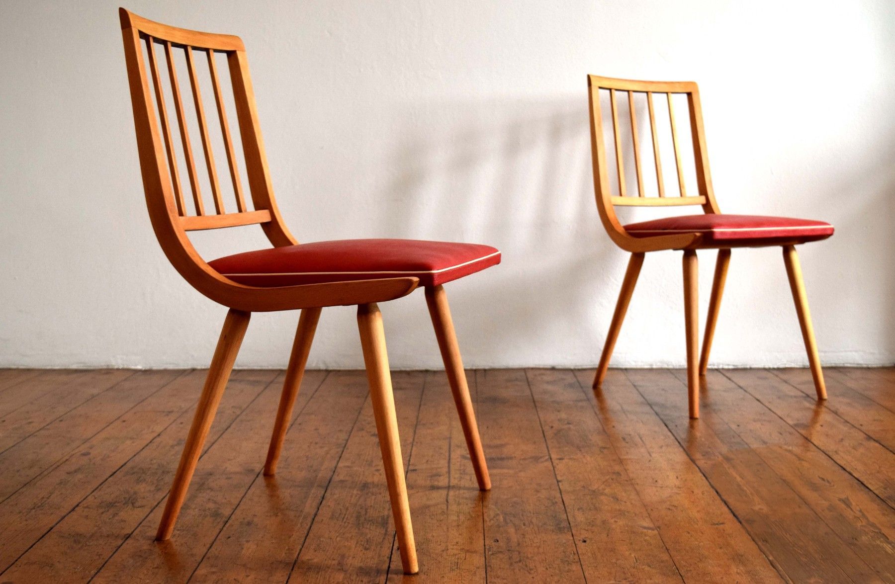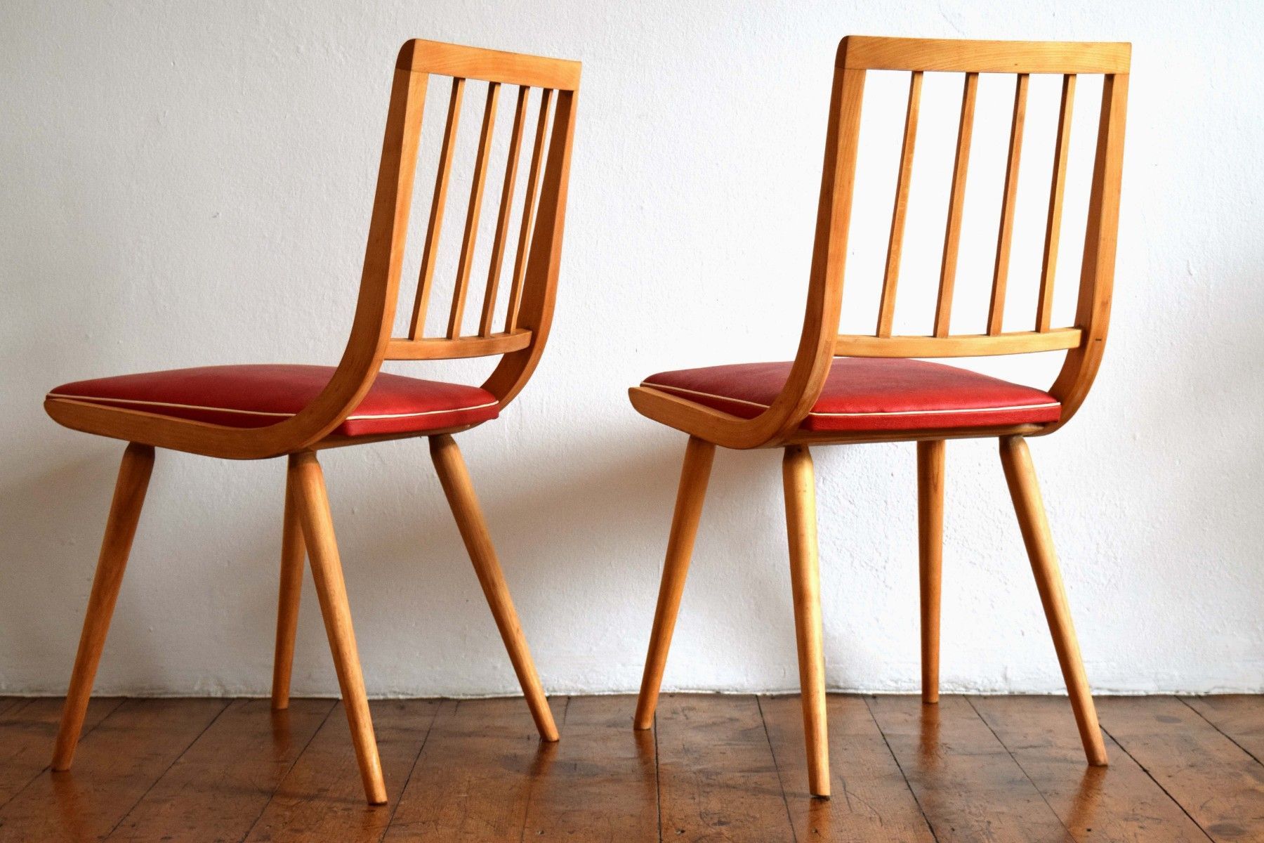 ein Paar (zwei Stück) historische Stühle (um 1960) aus Vollholz (Buche massiv), Sitzflächen Bezug aus Kunststoff (rot mit weißem Rand) guter Zustand, kräftige Farben, stabil und gepflegt, langfristig nutzbar einer der beiden Stühle hat eine kleine Öffnung am Rand des Bezuges (siehe Bild sieben und acht) Sitzhöhe 45, Lehnenhöhe 84cm, Breite 45cm, Tiefe 48cm Der Verkauf der beiden Stühle erfolgt als Paar.