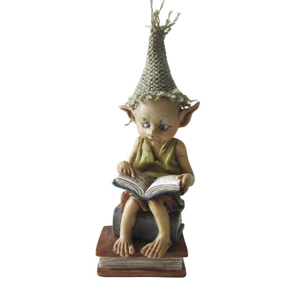 Ein Pixie liest in einem Buch nach - Wie war das noch?