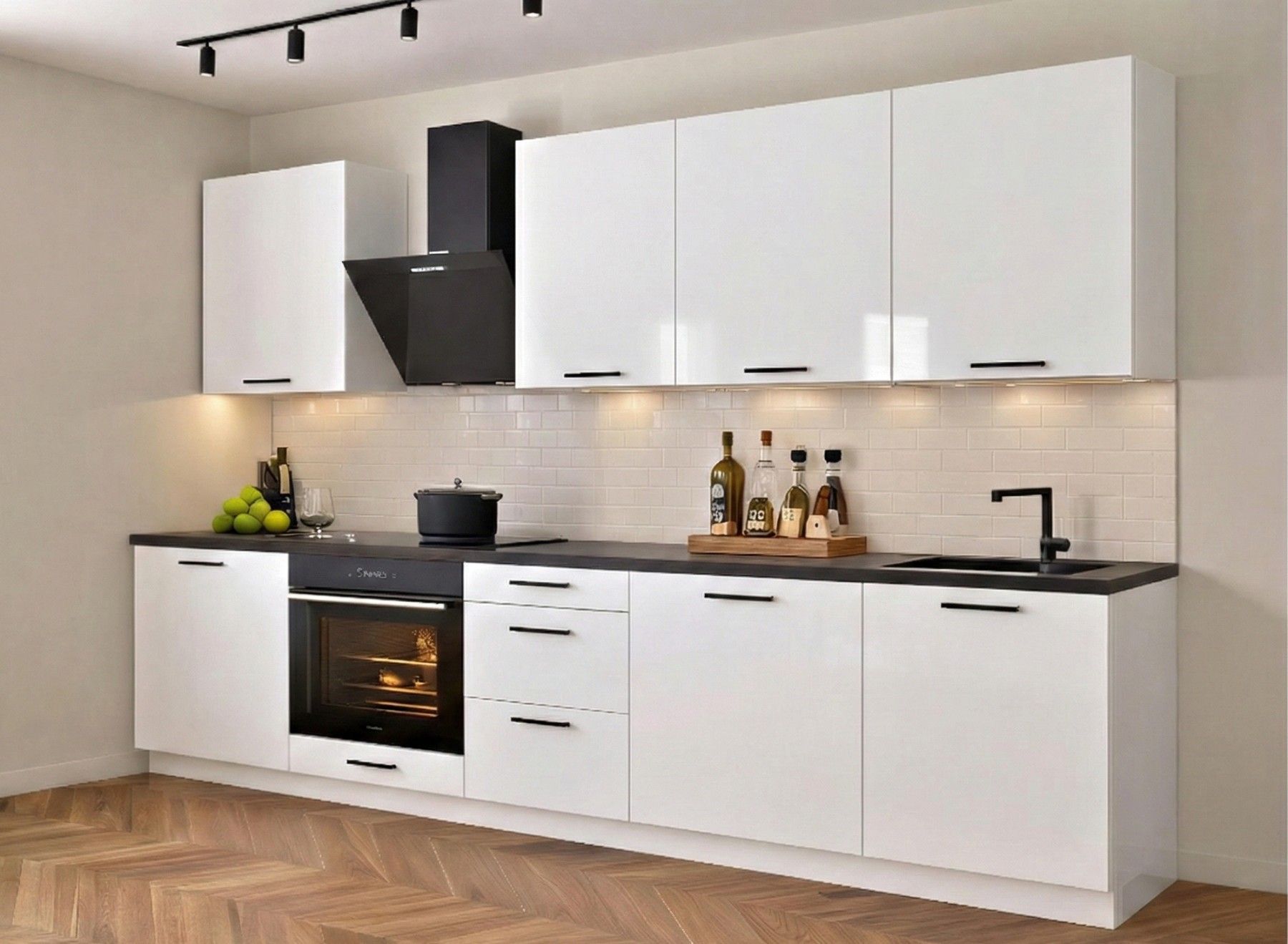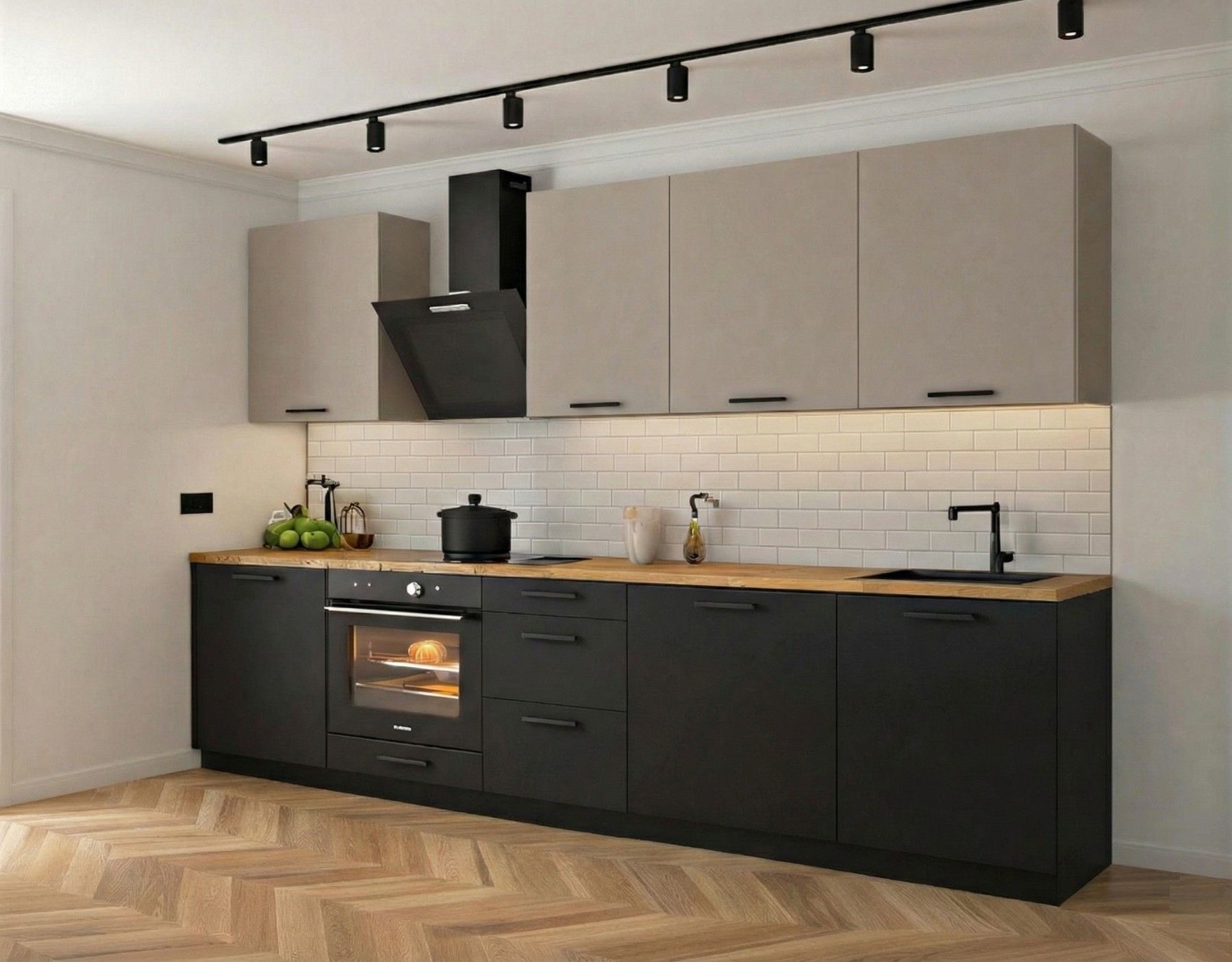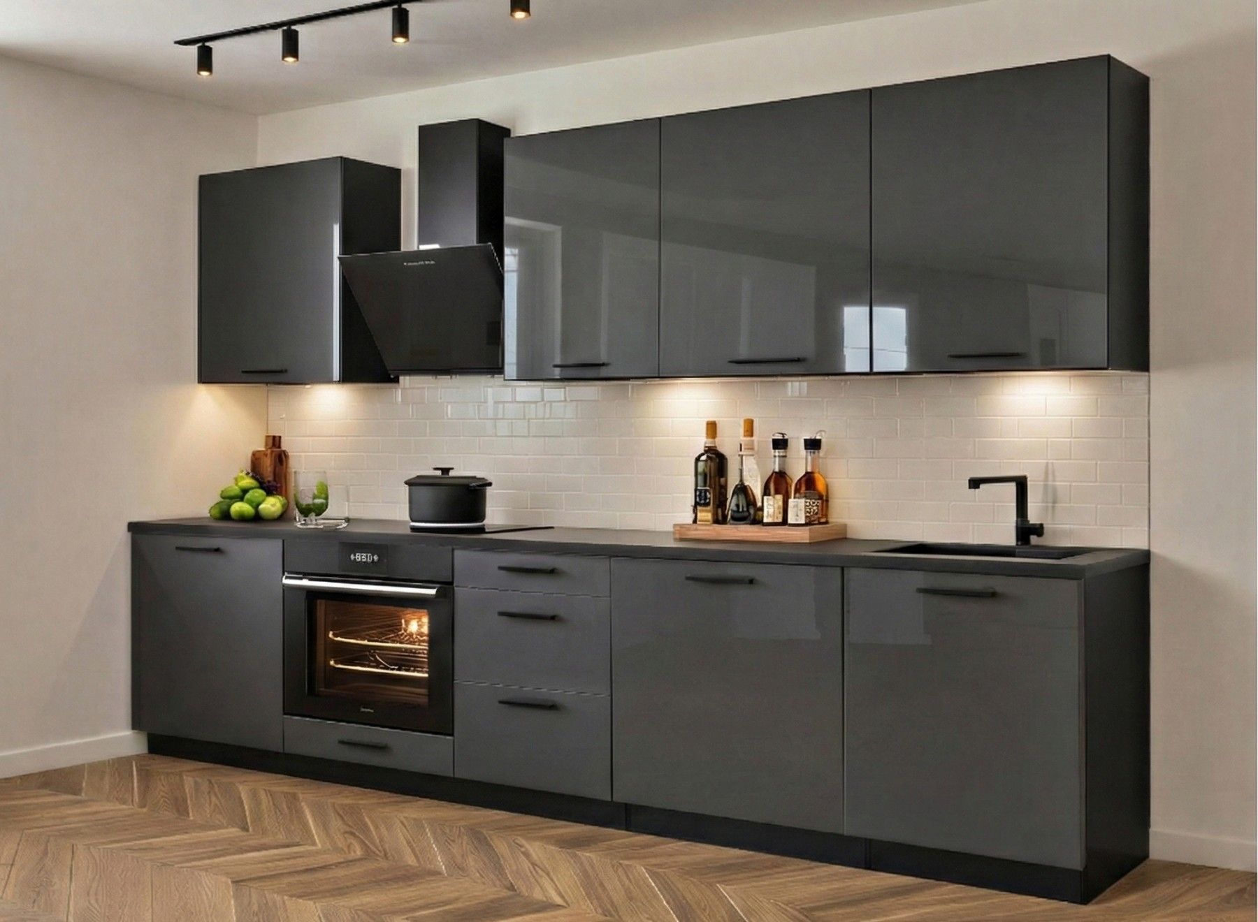Küchenzeile AXIS 290 cm – Modernes Design & zeitloser Minimalismus Die Küchenzeile AXIS 290 cm steht für klare Linien, ausgewogene Proportionen und ein modernes, zeitloses Design. Die grauen Fronten unterstreichen den minimalistischen Charakter der Küche und schaffen eine ruhige, elegante