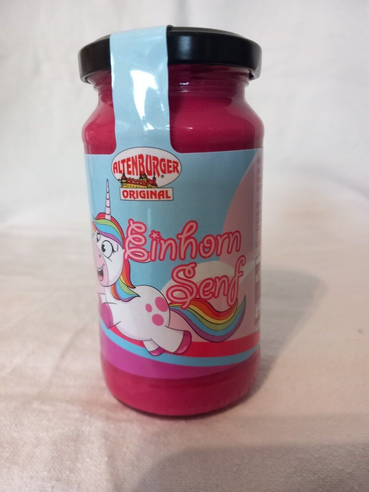 Einhorn Senf Mittelscharf 200 ml Glas - ACHTUNG MHD: 30.04.25 Ein Muss für alle Einhorn Fans. Der absolute Hingucker. Du wirst durch den zuckersüßen lieblichen Geschmack eingefangen. Hinzu kommt dann noch die Pink – Farbe. Er verfeinert alle pikante Gerichte. Dieser absolute Hingucker macht be