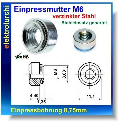 Einpressmutter M6, Setzmutter, 8.75mm, verzinkter Stahl, Stahleinsatz gehärtet, 10St.